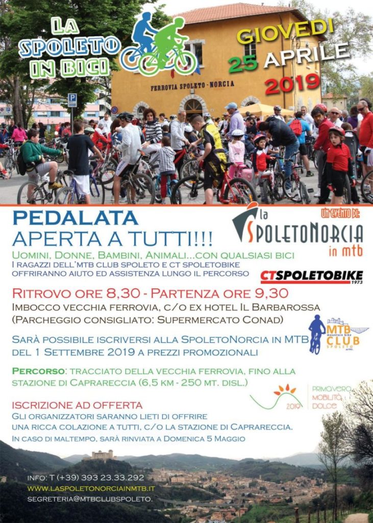 Con la primavera e le prime giornate con temperature più miti, torna la voglia per tutti di spolverare la propria bicicletta e di fare una bella passeggiata su due ruote. Come tradizione vuole, ecco allora uno degli appuntamenti più conosciuti delle due ruote spoletine: la Spoleto In Bici. Già presentata in Comune nelle scorse settimane, all’interno del più ampio calendario riguardante gli eventi sportivi di Spoleto in Primavera, la Spoleto in Bici ha mantenuto la data del 25 aprile, con tutte le sue caratteristiche di pedalata aperta a tutti (a prescindere dall’età e dalla preparazione atletica) ed a qualsiasi tipologia di bicicletta; saranno benvenuti anche gli animali! Il percorso sarà quello classico, lungo il primo tratta della Vecchia Ferrovia SpoletoNorcia, dal suo imbocco prezzo l’ex hotel Il Barbarossa, fino alla stazione di Caprareccia: 6,5 chilometri di natura tutta da respirare in grande tranquillità, anche grazie all’aiuto ed alla assistenza dei ragazzi del MTB Club Spoleto e del CT SpoletoBike.