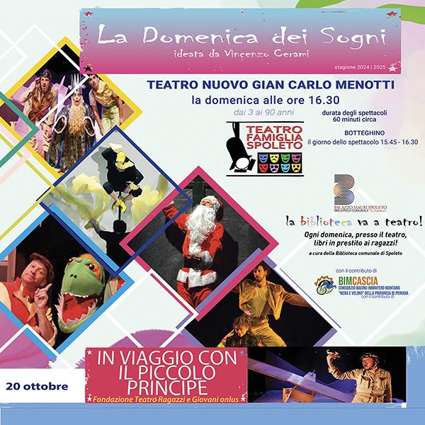 A partire dal 20 ottobre 2024 fino al 2 febbraio 2025 saranno cinque gli spettacoli che per un’ora allieteranno bambini e bambine con le loro famiglie al Teatro Nuovo “Gian Carlo Menotti” la domenica alle ore 16.30 accompagnati da alcune delle migliori compagnie d’Italia.