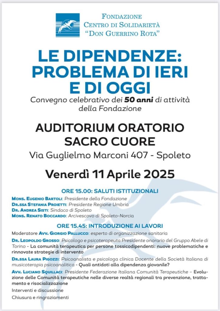 “Le dipendenze: problema di ieri e di oggi”. È il tema del convegno pensato per celebrare i 50 anni di attività della Fondazione Centro di Solidarietà “Don Guerrino Rota” di Spoleto, che si terrà venerdì 11 aprile 2025, dalle ore 15.00, presso la parrocchia del Sacro Cuore a Spoleto.