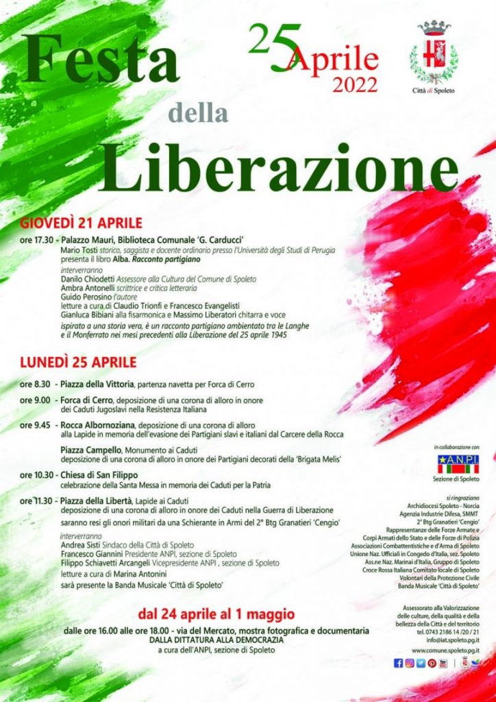 La presentazione del libro ‘Alba. Racconto partigiano’, la mostra fotografica e documentaria ‘Dalla dittatura alla democrazia’ e le celebrazioni del 25 aprile. Sono questi gli appuntamenti organizzati dall’amministrazione comunale, in collaborazione con ANPI sezione di Spoleto, per celebrare la 77ª FESTA DELLA LIBERAZIONE.
