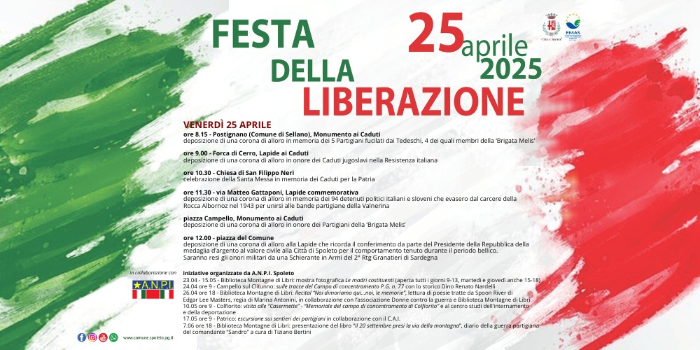 Celebrazioni, cerimonie, incontri, presentazione di libri e mostre nel programma di appuntamenti organizzati dal Comune di Spoleto in collaborazione con ANPI, Sezione di Spoleto, per celebrare il 25 aprile nell’80° anniversario della Liberazione d’Italia dall’occupazione nazista e dal regime fascista.