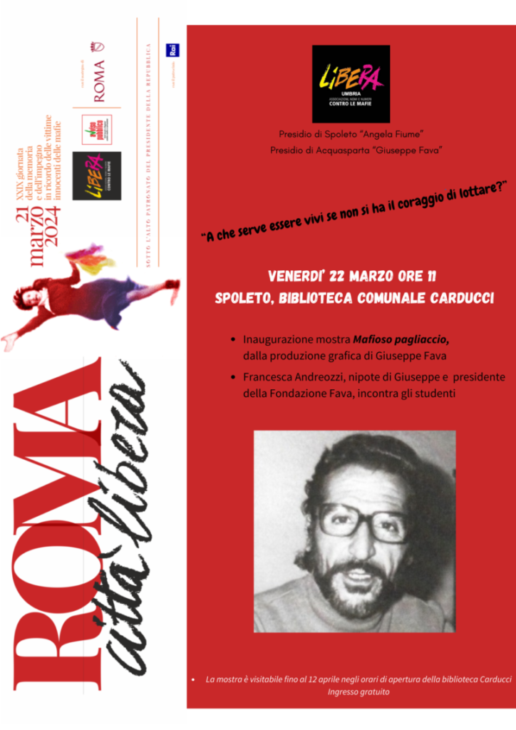 In occasione della XXIX Giornata della memoria e dell’impegno in ricordo della vittime innocenti delle mafie e nell’anniversario della morte del giornalista, drammaturgo e artista Giuseppe Fava, l’associazione Libera in collaborazione con il Comune di Spoleto inaugura la mostra “Mafioso pagliaccio”, esponendo a Palazzo Mauri i suoi bozzetti (acqueforti).