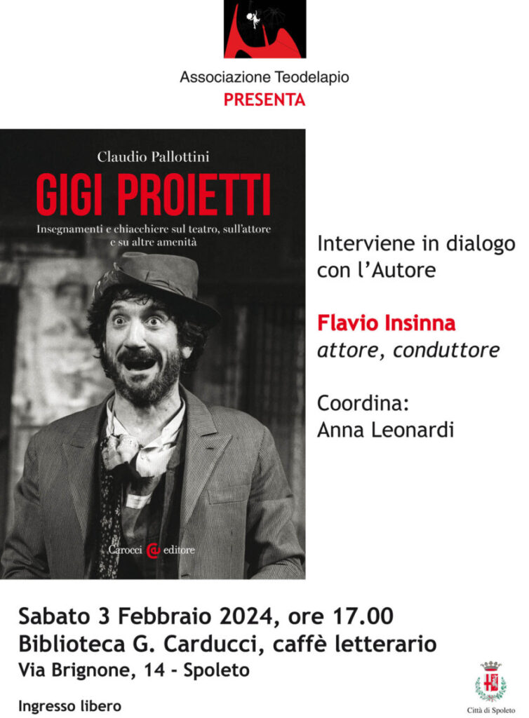Verrà presentato sabato 3 febbraio alle ore 17 il libro di Claudio Pallottini, edito da Carocci editore “GIGI PROIETTI. Insegnamenti e chiacchere sul teatro, sull’attore e su altre amenità”.