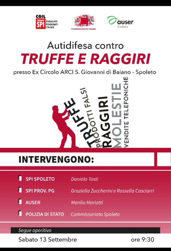 Sabato 13 settembre alle 9.30 nell’ex Circolo ARCI di San Giovanni di Baiano è in programma un appuntamento dal titolo “Autodifesa contro truffe e raggiri” organizzato dal Sindacato Pensionati Italiani – Spi CGIL, il Coordinamento donne e Auser Umbria.