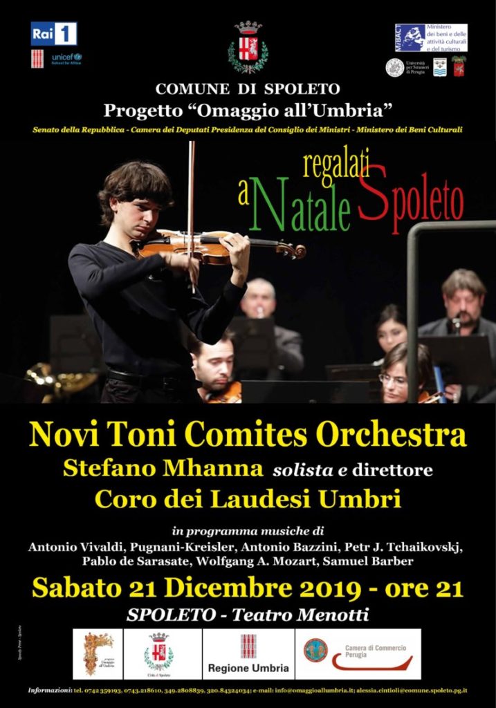Sabato 21 dicembre 2019 alle ore 21 al Teatro Nuovo Gian Carlo Menotti si terrà il tradizionale concerto di Natale della Città di Spoleto con la Novi Toni Comites Orchestra diretta dal violinista prodigio Stefano Mhanna. Si affianca all’orchestra il Coro dei Laudesi Umbri diretto da Padre Matteo Ferraldeschi. L’evento, atto conclusivo del progetto Omaggio all’Umbria, è inserito nel programma di Spoleto d’Inverno.