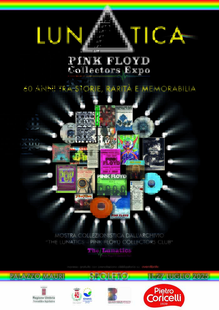 Grazie al patrimonio collezionistico del gruppo “The Lunatics”, collettivo italiano di riferimento per lo studio e la conoscenza storica e filologica dei Pink Floyd, l’importante materiale in esposizione, di estrema rarità, sarà allestito, dall’11 al 27 luglio 2025, su tre piani del seicentesco palazzo Mauri (sede della biblioteca comunale “G. Carducci” di Spoleto) per consentire una esaustiva narrazione diacronica e sincronica dell’iconico percorso del gruppo e per esaltare la complessa tessitura sinestetica e transmediale dell’estetica e del linguaggio floydiani.