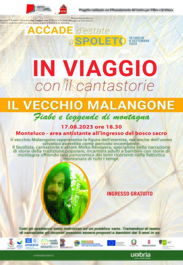 Nell’ambito della rassegna Accade d’estate a Spoleto, torna l’appuntamento con l’iniziativa “In viaggio con il cantastorie”, un viaggio in più tappe tra fiabe e leggende di tutti i tempi, nello stile dei cantastorie attraverso la saggezza dei popoli. Attore e pubblico entreranno insieme nell’avventura, nel tempo magico delle fiabe.
