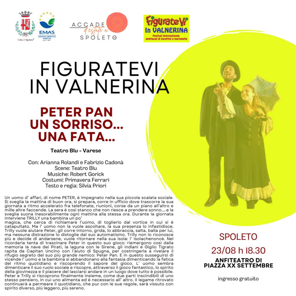 Nuovo appuntamento per il “Teatro incantato – Figuratevi in Valnerina” dedicato ai più piccoli con “Peter Pan, un sorriso… una fata…”, spettacolo del Teatro Blu di Varese con Arianna Rolandi e Fabrizio Cadonà, musiche di Robert Gorick, costumi di Primavera Ferrari, testo e regia di Silvia Priori, in programma venerdì 23 agosto alle 18.30 nell’anfiteatro di piazza XX settembre. L’ingresso è gratuito.