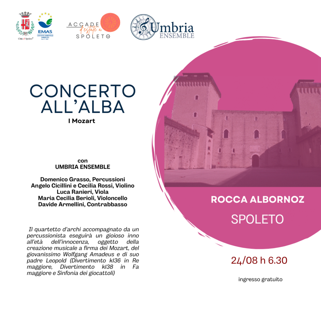Sabato 24 agosto torna anche questa estate l’appuntamento con il ‘Concerto all’alba’ alla Rocca Albornoz ad ingresso gratuito. Il concerto alle 6.30 sarà tenuto da Umbria Ensemble (Domenico Grasso, Percussioni; Angelo Cicillini e Cecilia Rossi, Violino; Luca Ranieri, Viola; Maria Cecilia Berioli, Violoncello; Davide Armellini, Contrabbasso) che eseguirà un gioioso inno all’età dell’innocenza, oggetto della creazione musicale a firma dei Mozart, del giovanissimo Wolfgang Amadeus e di suo padre Leopold (Divertimento k136 in Re maggiore, Divertimento k138 in Fa maggiore e Sinfonia dei giocattoli).
