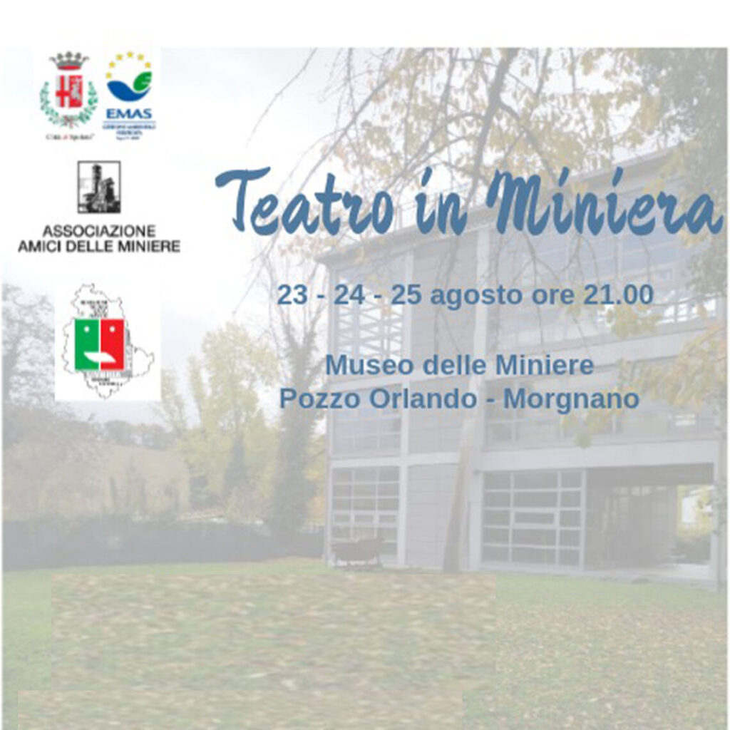 Dal 23 al 25 agosto alle ore 21.00 nel giardino delle Miniere di Morgnano andrà in scena la rassegna teatrale ad ingresso gratuito “Teatro in miniera” nata dalla collaborazione tra l’Associazione Amici delle Miniere Morgnano e la Federazione Italiana Teatro Amatori, FITA– Comitato regionale Umbria. Tre compagnie teatrali presenteranno spettacoli su tematiche legate al mondo delle miniere: venerdì 23 agosto “Lavoro e schiavitù” del Centro Artisti Teatro di Porano di Terni, sabato 24 agosto “Grisù Giuseppe e Maria” della Compagnia Teatrale “le Voci di dentro” di Assisi e domenica 25 agosto “A sirene spente” dell’Accademia Barbanera APS di Castelgiorgio (Tr).