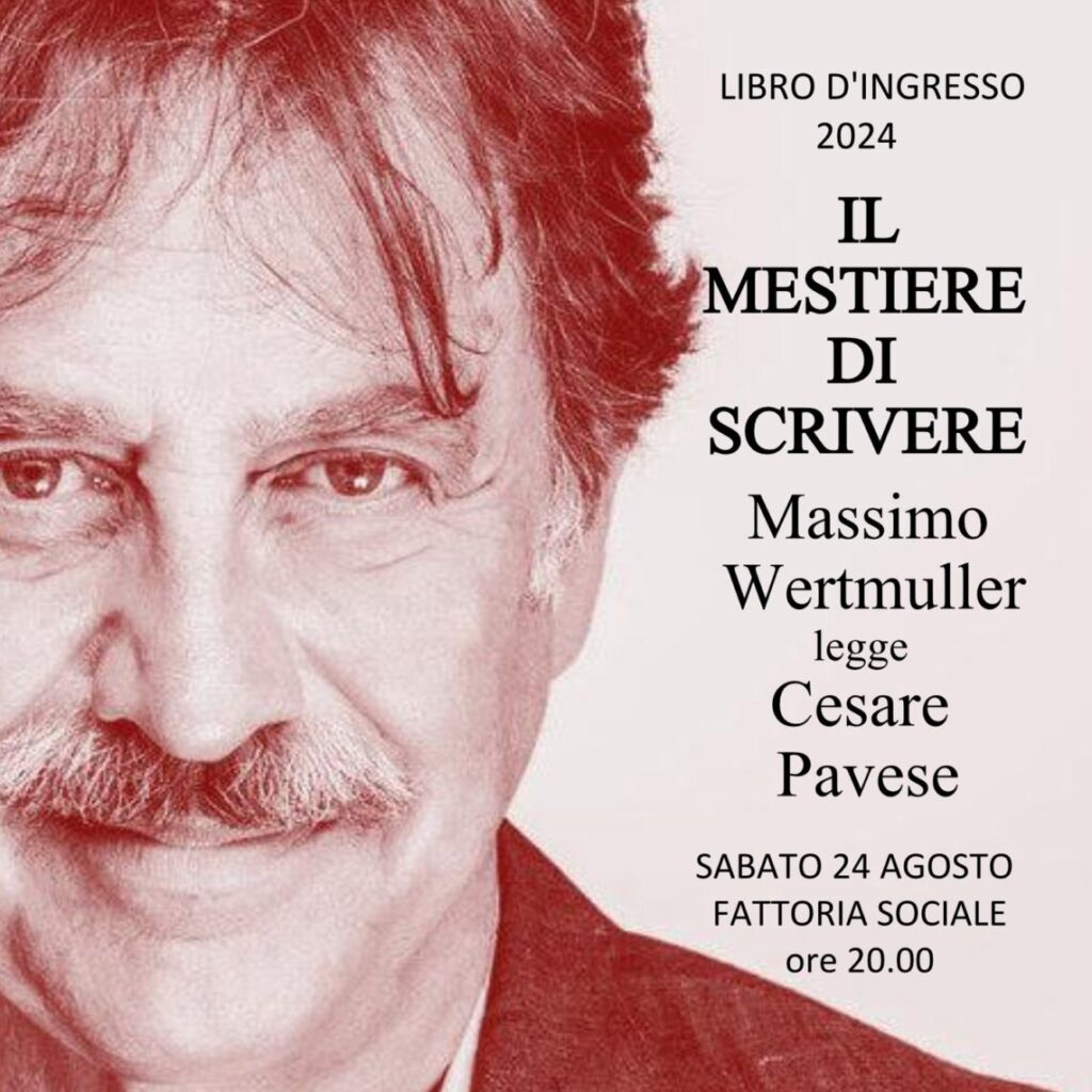 Sabato 24 agosto alle ore 20.00 nella sede della Fattoria Sociale di Protte per “Libro d’ingresso” si terrà “Il mestiere di scrivere” Massimo Wertmuller legge Cesare Pavese. Il costo di partecipazione alla cena e al momento culturale è di € 20,00 e la prenotazione è obbligatoria chiamando il numero 3346483553.
