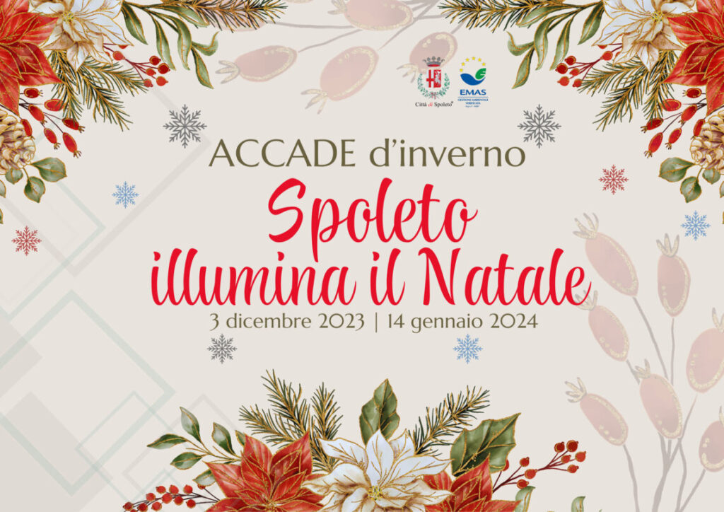 Per salutare il 2023 è in programma, il 31 dicembre in piazza Garibaldi a partire dalle ore 23.00, lo spettacolo Fontane danzanti e giochi d’acqua accompagnati da musica dal vivo con lo spettacolo di Cazacu’s, mentre il 6 gennaio dalle ore 17.00, sempre in piazza Garibaldi, ci sarà Aspettando la Befana a cura della Croce Rossa Italiana Comitato di Spoleto e del Comando dei Vigili del Fuoco di Spoleto. Prima della Festa del Santo Patrono (14 gennaio), è in programma il 13 gennaio alle ore 17.00 a Palazzo Mauri l’incontro 50 anni di ‘Selling England by the Pound’ dei Genesis, uno dei capolavori del prog raccontato da Mario Giammetti, tra i maggiori esperti internazionali dei Genesis.