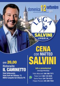 Comunicati stampa: – Elezioni Spoleto, Matteo Salvini domenica 12 settembre incontra i cittadini al ristorante “Il Caminetto” di Campello sul Clitunno