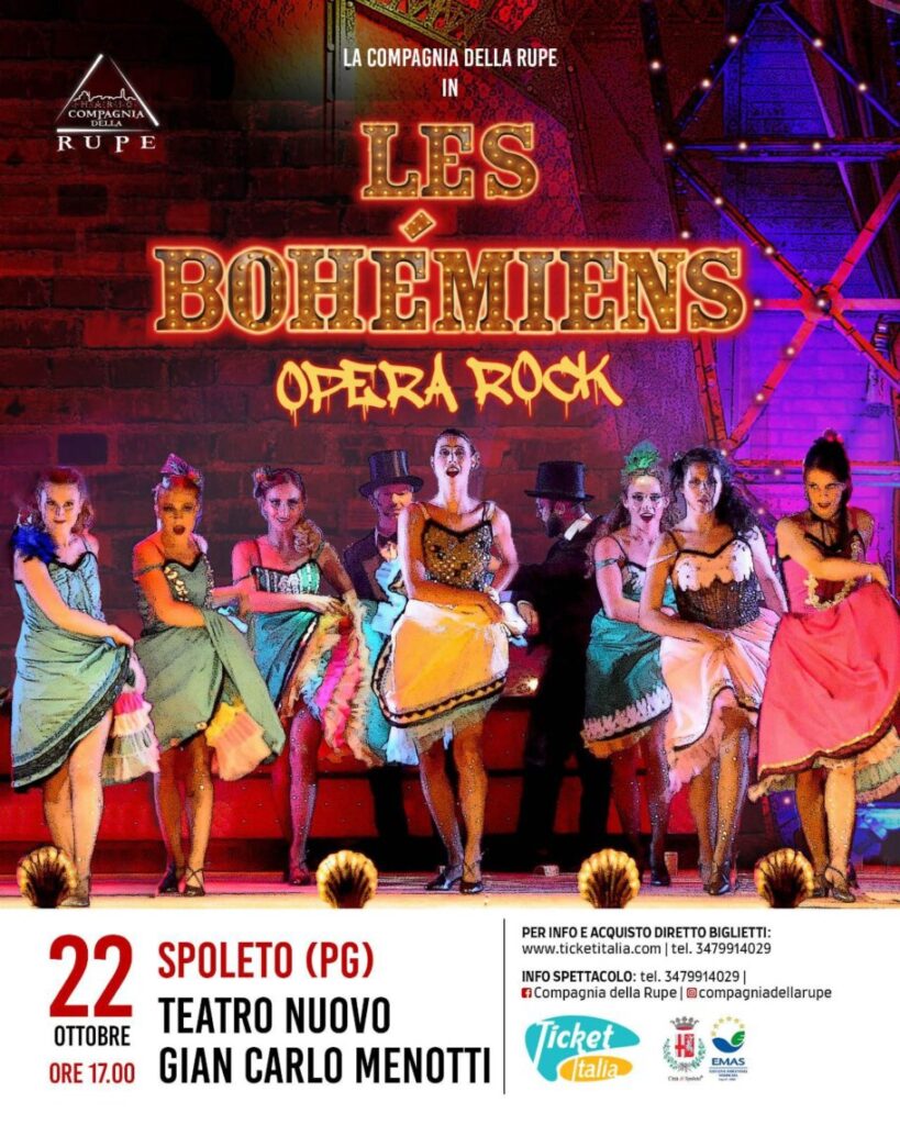 Per Accade d’autunno a Spoleto arriva al Teatro Nuovo Gian Carlo Menotti lo spettacolo Les Bohémiens Opera Rock. L’appuntamento, in programma domenica 22 ottobre alle ore 17 e organizzato dalla Compagnia della Rupe, è un musical ispirato al film “Moulin Rouge!” di Baz Luhrmann, che ha debuttato nell’agosto del 2018, nato da un’idea di Marcello Brinchi.