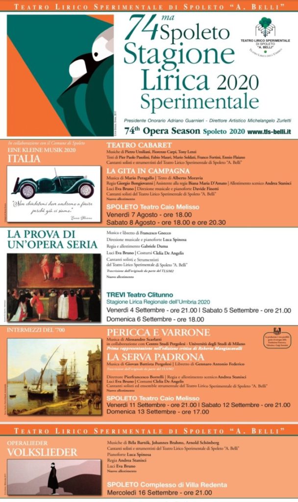 Al via alla 74ma Stagione Lirica Sperimentale di Spoleto e dell’Umbria che, malgrado le vicissitudini in seguito al Covid-19, avrà inizio in agosto con la consueta kermesse musicale al Teatro Caio Melisso [spettacoli: venerdì 7 agosto ore 18.00, sabato 8 agosto ore 18.00 e ore 20.30], in collaborazione con il Comune di Spoleto nell’ambito di Spoleto d’estate: EINE KLEINE MUSIK 2020 – Italia. Protagonista assoluta della serata, dopo la Francia nel 2018 e la Spagna nel 2019, è l’Italia. Una serata di teatro cabaret con musiche di Piero Umiliani, Fiorenzo Carpi e Tony Lenzi e testi di Pier Paolo Pasolini, Fabio Mauri, Mario Soldati, Franco Fortini, inframmezzati dalla lettura di brani di Ennio Flaiano (interpretati da Giovanni Moschella e Bianca Maria D’Amato) che fungeranno da prologo alla messa in scena de LA GITA IN CAMPAGNA di Mario Peregallo, su libretto di Alberto Moravia. La regia sarà affidata a Giorgio Bongiovanni, collaboratore dello Sperimentale da molti anni, con regista assistente Bianca Maria D’Amato e allestimento scenico di Andrea Stanisci. Direzione musicale e al pianoforte Davide Finotti. «La pièce si pone all’incrocio di tendenze neorealiste – rilevabili nell’ambientazione, che contrasta fortemente con l’estrazione snob dei due fidanzatini – grottesche (l’assurdità del rituale cui vengono sottoposti Mario e Ornella) e genericamente satiriche: l’involontario spogliarello è contrappuntato da marcati richiami al jazz, […] mentre il resto della scorrevole partitura si situa dalle parti di una ‘dodecafonia moderata’, a tratti orecchiabile (ritmi di valzer), che non ostacola minimamente l’intelligibilità delle parole» (Baldini e Castoldi). Assistendo allo spettacolo sarà dunque possibile immergersi completamente nel clima del Dopoguerra in Italia attraverso testi e musiche dei più rappresentativi autori dell’epoca; basti pensare che lo stesso libretto è un adattamento di “Andare verso il popolo”, uno dei racconti di Moravia.