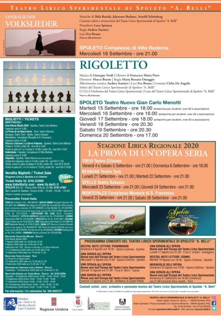 L’appuntamento con Operalieder VOLKSLIEDER (regia di Andrea Stanisci – solisti del Teatro Lirico Sperimentale di Spoleto “A.Belli” con musiche di Bela Bartók, Johannes Brahms e Arnold Schoenberg) è previsto presso il Complesso di Villa Redenta-Sala Monterosso mercoledì 16 settembre ore 21.00.