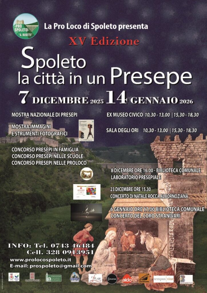 La magia del Natale torna ad accendersi a Spoleto con la quindicesima edizione di “Spoleto, la città in un Presepe”, una manifestazione che negli anni è diventata un appuntamento irrinunciabile per cittadini, famiglie e visitatori. Dal 7 dicembre 2025 al 14 gennaio 2026, la Pro Loco “A. Busetti” propone un percorso diffuso che intreccia tradizione, creatività e memoria storica, trasformando la città in un grande presepe vivente fatto di arte, musica e partecipazione .Gli spazi dell’Ex Museo Civico, aperti dalle 10:30 alle 13:00 e dalle 15:30 alle 18:30, ospiteranno mostre e iniziative pensate per coinvolgere persone di tutte le età. Tra queste, la tradizionale Mostra Nazionale di Presepi e i concorsi dedicati ai presepi in famiglia, nelle scuole e nelle Pro Loco, che ogni anno valorizzano la creatività e la passione delle realtà del territorio. La mostra di immagini e strumenti fotografici – un viaggio nella memoria Nella suggestiva Sala degli Ori, aperta dalle 10:30 alle 13:00 e dalle 15:30 alle 18:30, trova spazio la mostra di immagini e strumenti fotografici, curata da A. Campelletti e A. Caruso, un’iniziativa che arricchisce il programma con un taglio culturale e storico particolarmente significativo. L’esposizione propone un affascinante percorso attraverso antiche apparecchiature, fotografie originali e materiali d’epoca che raccontano l’evoluzione del linguaggio fotografico e il modo in cui la città, le sue persone e i suoi paesaggi sono stati immortalati nel tempo.Grazie alla cura dei due autori, la mostra non è solo un’esposizione tecnica, ma un vero viaggio nella memoria visiva della comunità, capace di rivelare frammenti di vita quotidiana, tradizioni e cambiamenti che continuano a parlare al presente.
