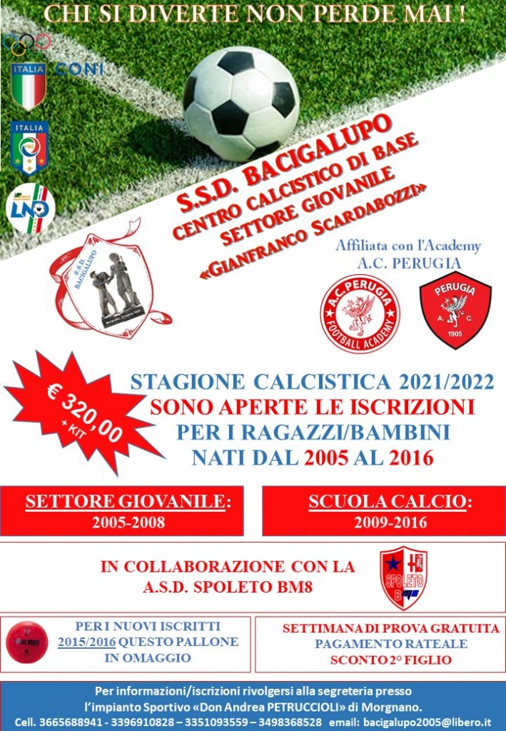 (DMN) Spoleto – sono iniziate in questi giorni le iscrizioni per la scuola calcio, centro calcistico di base e settore giovanile – dedicato alla memoria di Gianfranco Scardabozzi – della storica società SSD Bacigalupo. La società di Morgnano di Spoleto, guidata da Luca Scardabozzi, dallo scorso anno può vantare l’affiliazione con l’A.C. Perugia Calcio Academy e svolgerà le attività al “Don Andrea Petruccioli” in collaborazione con l’Asd Spoleto BM8.