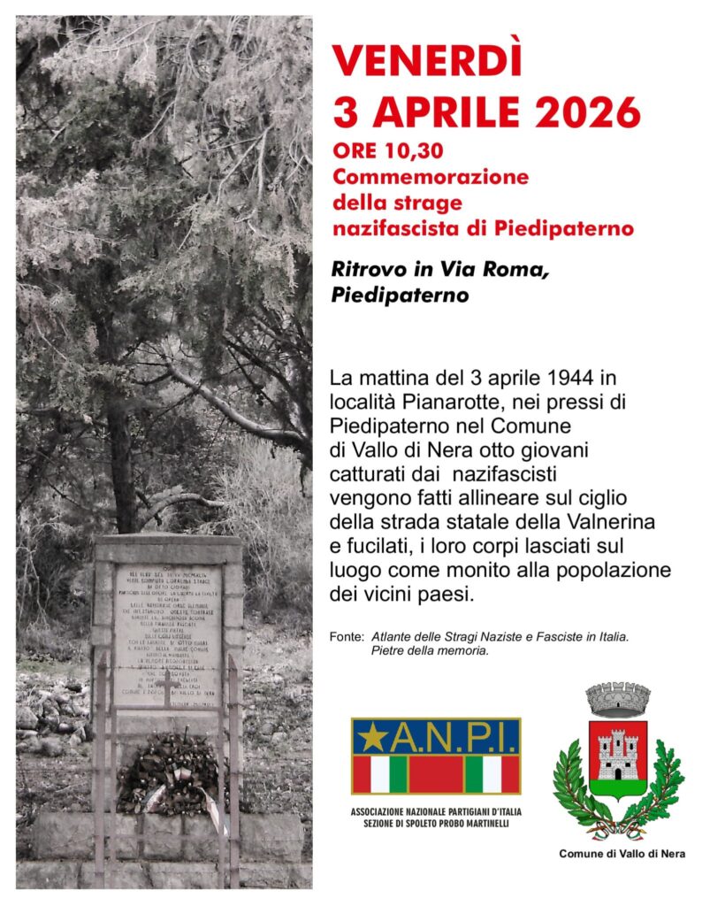 Venerdì 3 aprile a Piedipaterno, alle ore 10,30 in via Roma, l’Associazione Nazionale Partigiani d’Italia sezione di Spoleto “Probo Martinelli” e il Comune di Vallo di Nera con una cerimonia pubblica ricorderanno gli otto giovani trucidati dai nazifascisti a Pianarotte, vicino Piedipaterno, all’alba del 3 aprile 1944.