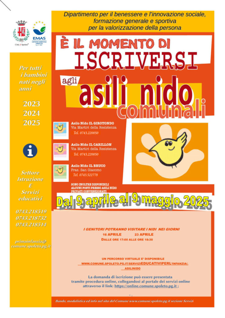 Dal 9 aprile al 9 maggio sono aperte le iscrizioni agli asili nido comunali per l’anno educativo 2025-26. Tutta la documentazione (bando, modello per la richiesta di agevolazione, locandina e regolamento) è online nel sito del Comune di Spoleto https://bit.ly/3RaOthy.