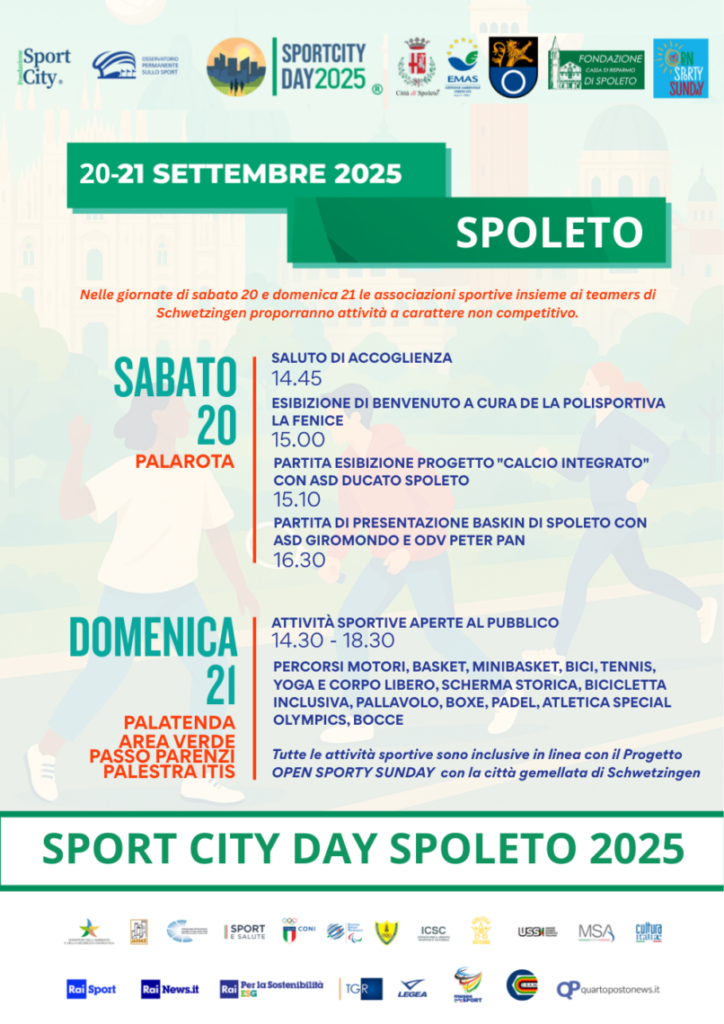 Torna a Spoleto lo Sportcity Day, l’evento organizzato dalla Fondazione Sportcity per incentivare il benessere dei cittadini, stimolando la felicità e la cultura del movimento, a cui il Comune ha aderito anche per l’edizione 2025.