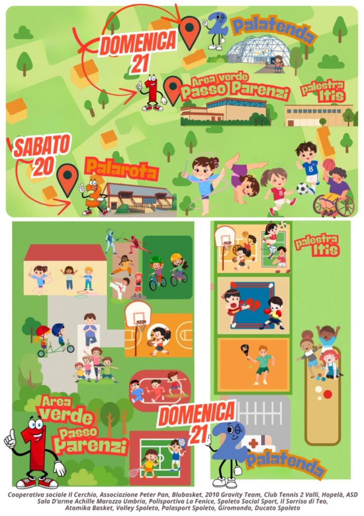 Il Comune di Spoleto ringrazia tutte le associazioni che prenderanno parte all’iniziativa: Cooperativa sociale Il Cerchio, Associazione Peter Pan, Blu Basket Spoleto, 2010 Gravity Team, Club Tennis 2 Valli, Hopelà, ASD Sala D’arme Achille Marozzo Umbria, Polisportiva La Fenice, Spoleto Social Sport, Il Sorriso di Teo, Atomika Basket, Volley Spoleto, Palasport Spoleto, Giromondo, Ducato Spoleto.