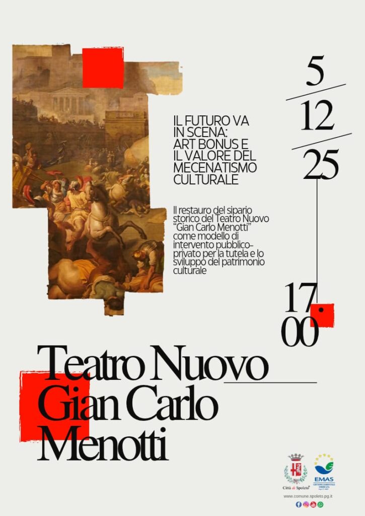 Giovedì 5 dicembre, alle ore 17.00, la Sala XVII Settembre del Teatro Nuovo Gian Carlo Menotti ospiterà il convegno “Il futuro va in scena: Art Bonus e il valore del mecenatismo culturale. Il restauro del sipario del Teatro Nuovo ‘Gian Carlo Menotti’ come modello di intervento pubblico-privato per la tutela e lo sviluppo del patrimonio culturale”.