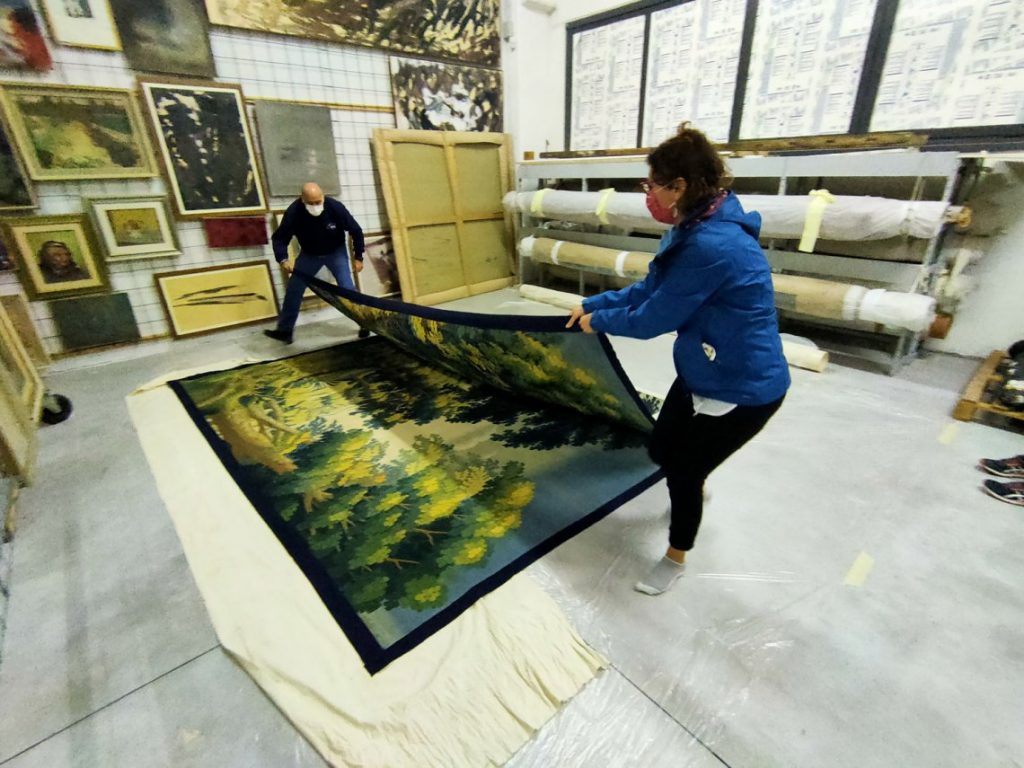 Questa mattina i tecnici restauratori del Consorzio, accompagnati dal dirigente Sandro Frontalini, dall’esperta in beni storico-artistici Antonella Proietti e dall’architetto Maria Angela Marchetti, hanno effettuato una verifica sullo stato dell’arazzo conservato al deposito comunale di Santo Chiodo, che è stato successivamente trasportato al laboratorio del Museo del Tessuto di Prato.