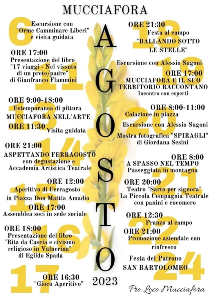 Il programma è davvero ricchissimo e denso di appuntamenti. Si inizia il 6 agosto con l’escursione “Camminare liberi”, si prosegue poi con la mostra estemporanea di pittura denominata “Mucciafora nell’arte” il 13, fino a giungere, con molti altri eventi, all’aperitivo di Ferragosto e alla festa “Ballando sotto le stelle” del 18 agosto. L’agosto di Mucciafora si chiuderà poi il 24 con la festa del Patrono San Bartolomeo.