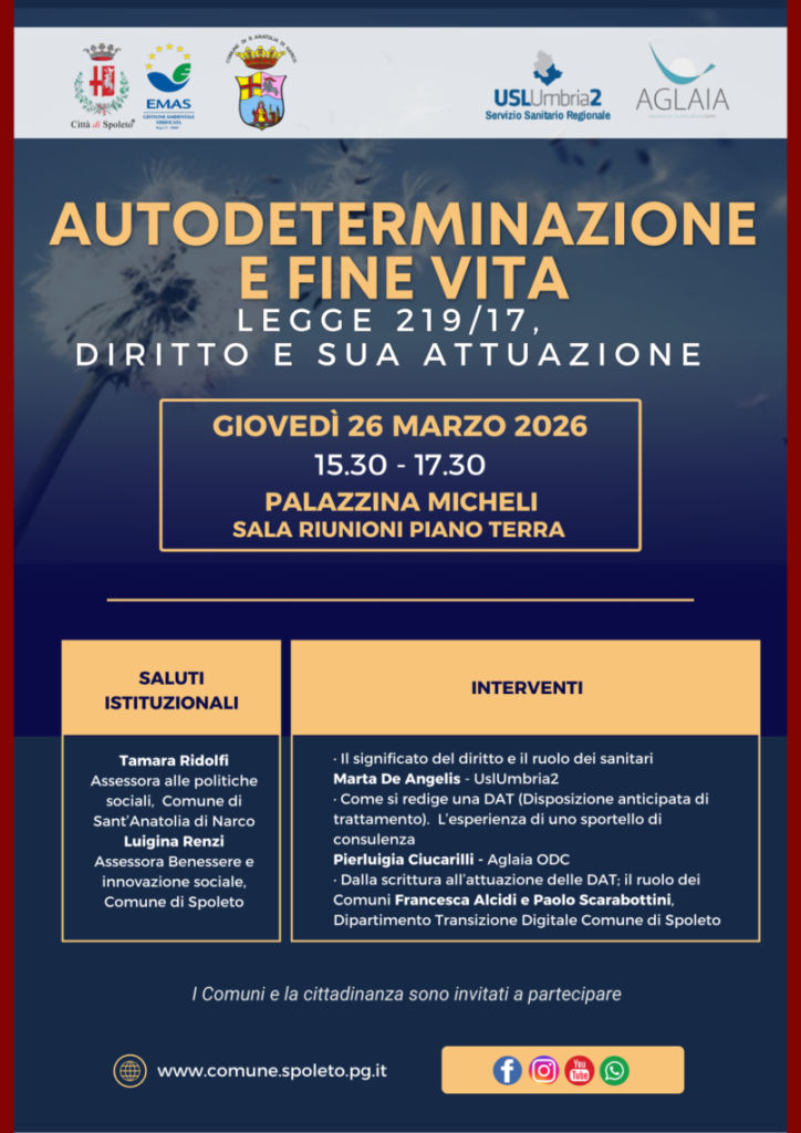 Dopo i saluti istituzionali di Tamara Ridolfi, Assessora alle politiche sociali Comune di Sant’Anatolia di Narco, e di Luigina Renzi, Assessora Benessere e Innovazione Sociale Comune di Spoleto, si susseguiranno gli interventi di Marta De Angelis, USL Umbria 2 (Il significato del diritto e il ruolo dei sanitari), Pierluigia Ciucarilli, Aglaia ODC (Come si redige una DAT: l’esperienza di uno sportello di consulenza), Francesca Alcidi e Paolo Scarabottini, Dipartimento Transizione Digitale, Comune di Spoleto (Dalla scrittura all’attuazione delle DAT: il ruolo dei Comuni).