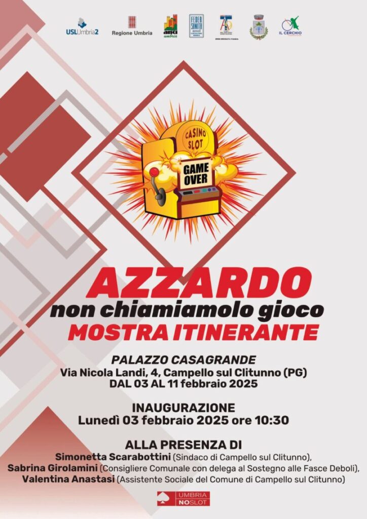 Palazzo Casagrande di Campello sul Clitunno sarà il luogo in cui dal 03 al 11 febbraio 2025 si terrà l’esposizione della mostra itinerante di vignette umoristiche realizzate da artisti italiani dal titolo “Azzardo non chiamiamolo gioco”.