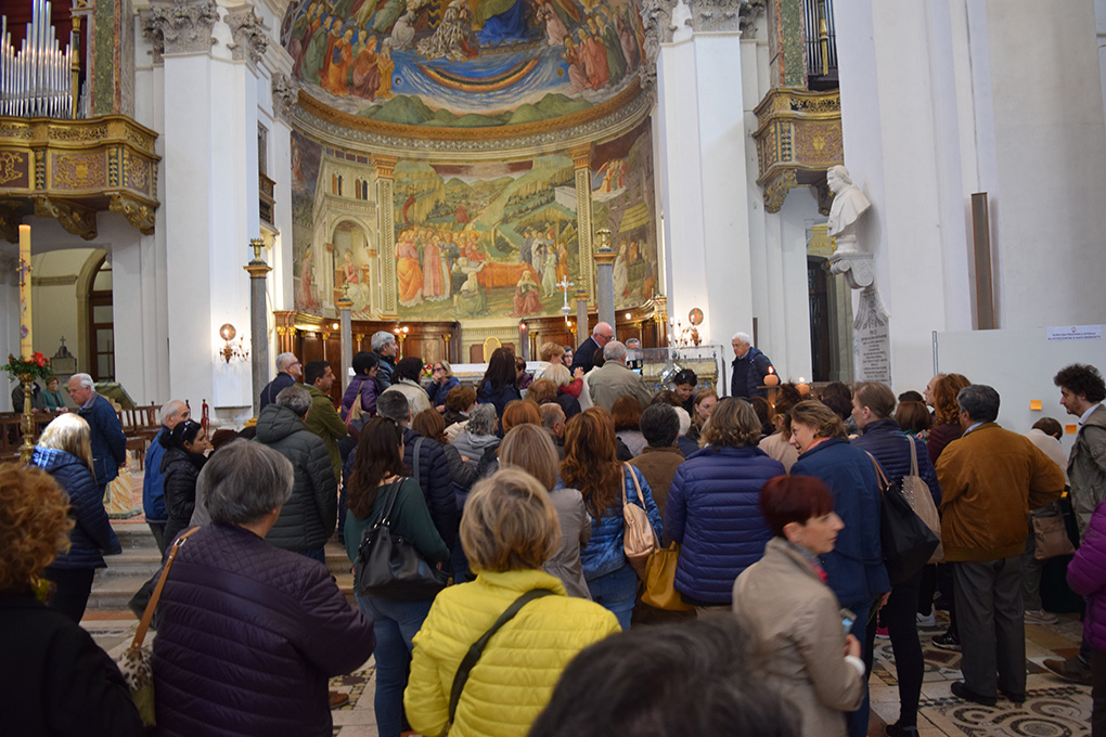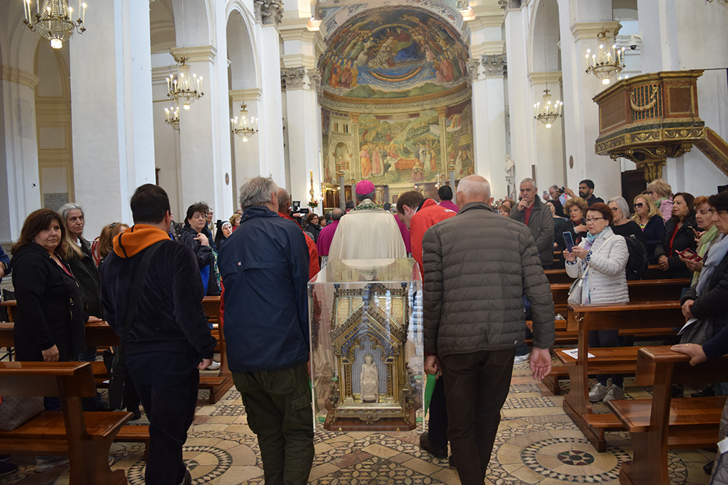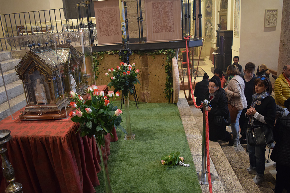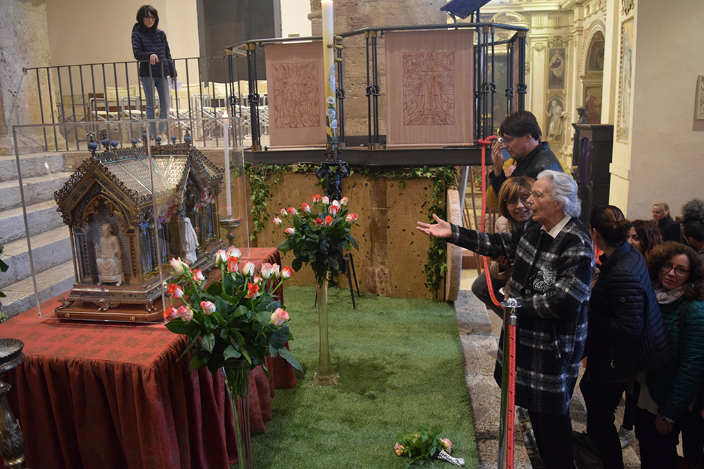 Nella giornata di giovedì 16 maggio 2019 tantissime persone da varie parti dell’Umbria hanno raggiunto la bella chiesa di S. Michele Arcangelo a Bevagna, nella centralissima piazza di S. Silvestro della Città delle Gaite, per venerare le reliquie di Santa Bernadette Soubirous giunte da Lourdes, la giovinetta alla quale nel 1858 apparve la Vergine Maria nella cittadina francese dei Pirenei. La tappa delle reliquie nella Chiesa di Spoleto-Norcia è stata l’unica in Umbria. «È stato un via vai di gente continua», commenta il parroco don Claudio Vergini. «Sono giunti fedeli da Foligno, da Spello, da Assisi, da Giano dell’Umbria, da Trevi e da tanti altri centri della nostra Regione. Tante le telefonate giunte in canonica per avere informazioni circa la permanenza delle reliquie. Siamo veramente grati al Signore per queste intense esperienze di preghiera e al nostro Arcivescovo che ha voluto che le reliquie fossero anche nella nostra parrocchia: è stato un bel momento di grazia». E alla Messa delle 18.00 presieduta da mons. Boccardo le tre navate e la zona del presbiterio della grande chiesa romanica erano stracolme di fedeli, molti dei quali sono rimasti in piedi.