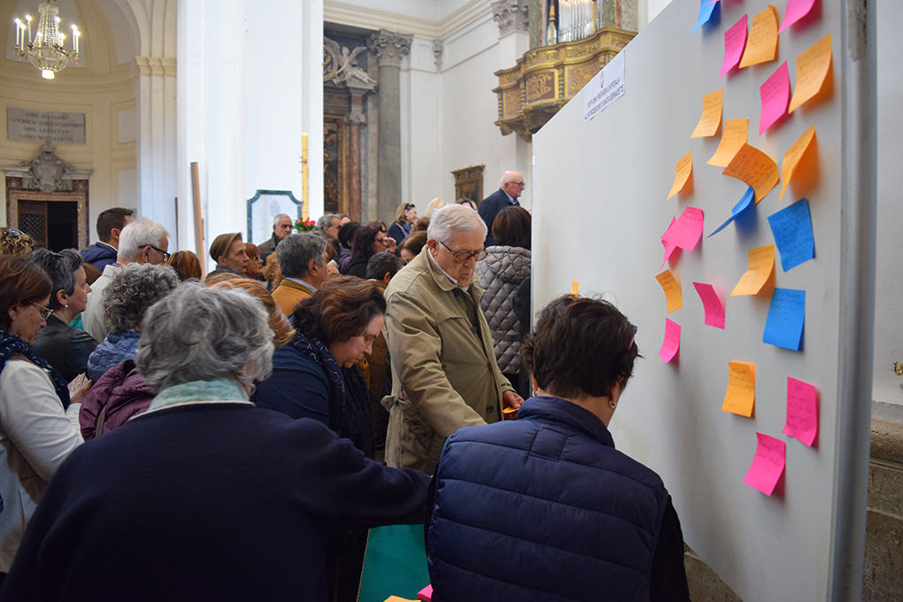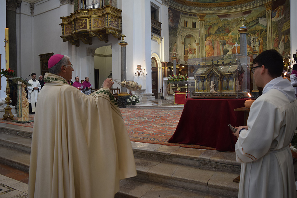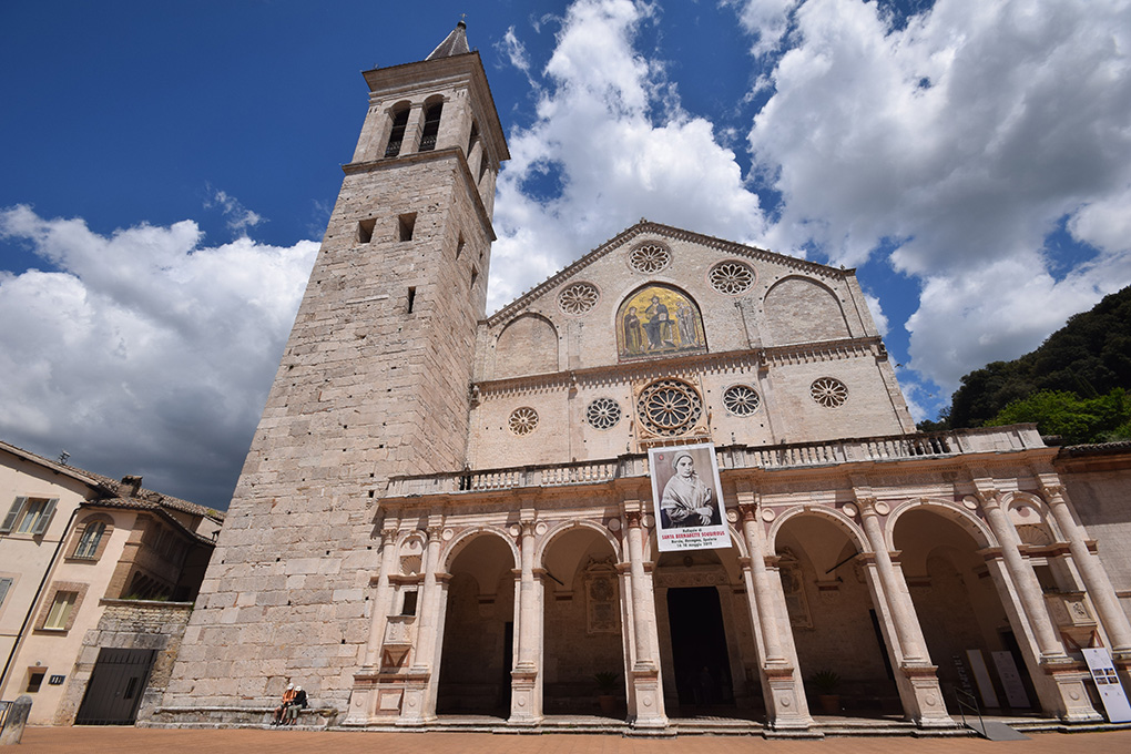 La mattina di venerdì 17 maggio 2019 le reliquie hanno lasciato Bevagna e alle 12.00 sono giunte in Pizza Duomo a Spoleto, accolte dall’arcivescovo Renato Boccardo e dal Capitolo dei Canonici della Cattedrale. Presente il sindaco Umberto de Augustinis con la consorte. Anche qui molte le persone che hanno voluto assistere all’arrivo e alla preghiera dell’Ora Media. C’era anche un gruppo di fedeli di Agropoli, città del Cilento in provincia di Salerno: avevano in programma il loro annuale pellegrinaggio a Cascia e Roccaporena sulle orme di Santa Rita. Saputo tramite internet della presenza delle reliquie di Santa Bernadette a Spoleto, hanno fatto tappa nella Città del Festival dei 2 Mondi e si sono uniti alla preghiera degli spoletini. Le reliquie sono state sistemate nel presbiterio; di fianco è stato posizionato un pannello dove le persone possono attaccare dei post-it colorati dopo avervi scritto la loro richiesta di preghiera a Santa Bernadette.