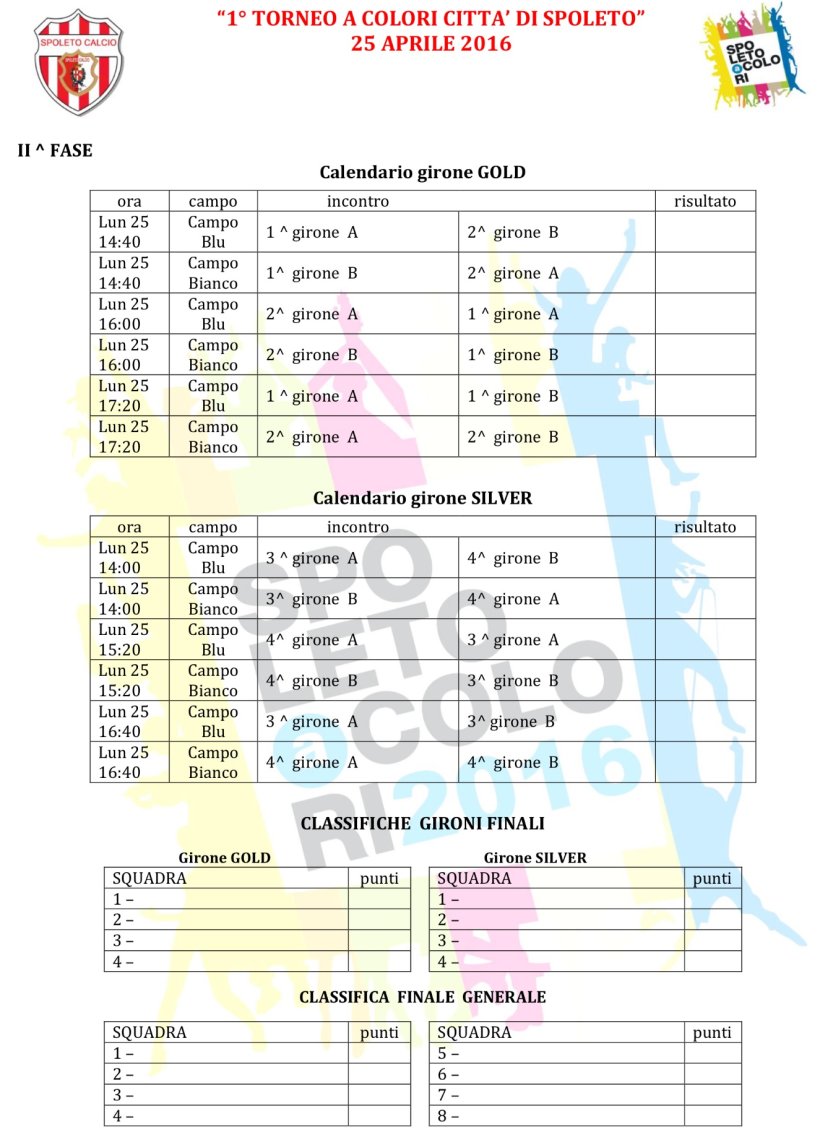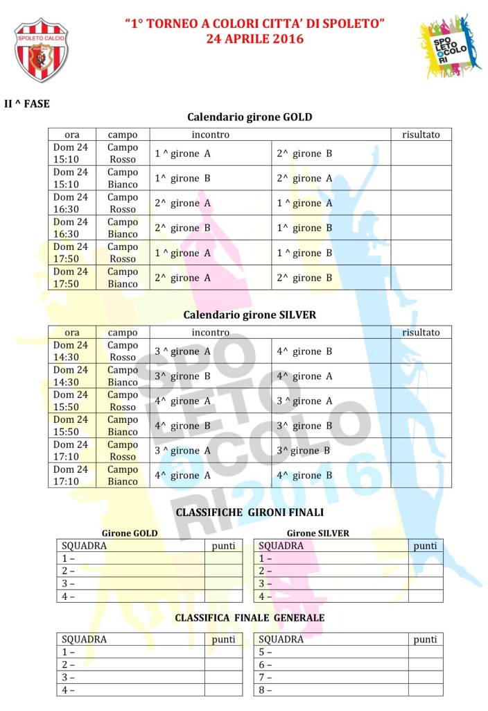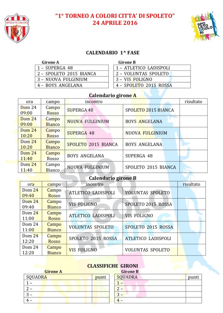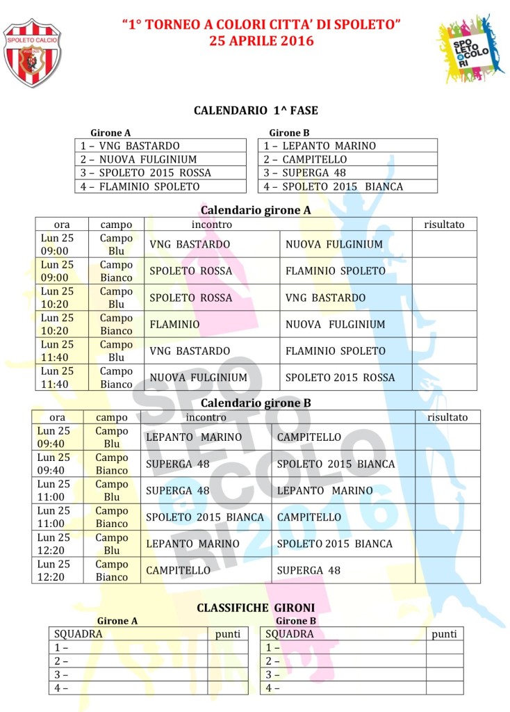 il torneo é dedicato alla categoria “piccoli amici 2008/2909”, parteciperanno le società : Lepanto Marino, Nuova Gualdo Bastardo, Nuova Fulginium, Superga 48, Spoleto 2015 bianco, Spoleto 2015 rosso e Flaminio Spoleto . Le gare si svolgeranno in due tempi della durata di 15′ ciascuno e verranno giocate come da regolamento in campi di dimensioni ridotte con 5 giocatori per squadra. Gli incontri avranno luogo per l’intera giornata dalle ore 9:00 alle 17:00 circa.