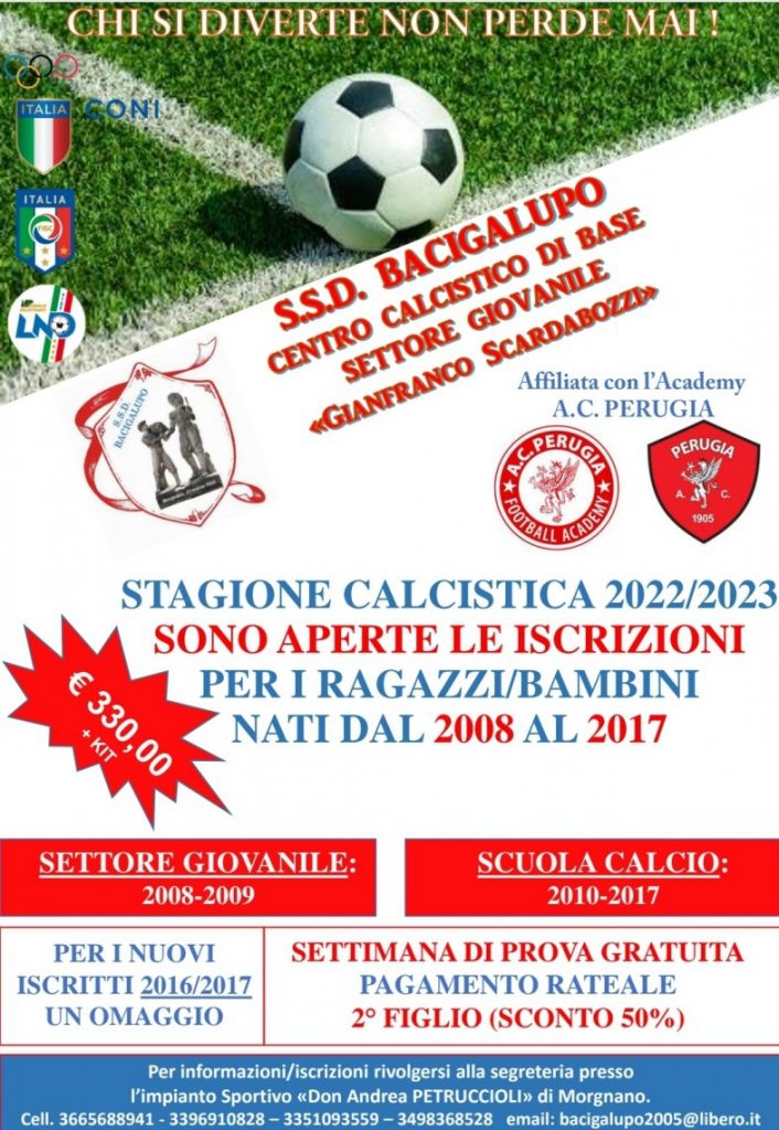 Da sottolineare il fresco rinnovo dell’affiliazione con l’A.C. Perugia Calcio da parte della società spoletina. Tale rinnovo si è concretizzato nella giornata di ieri (14 luglio 2022), presso la sede di Pian di Massiano, con la presenza del vice presidente dell’A.C. Perugia Calcio Mauro LUCARINI da una parte e dal Presidente Luca SCARDABOZZI, accompagnato dal responsabile dell’area tecnica della BACIGALUPO, ex grifone, Paolo STÒ dall’altra (vds. foto).