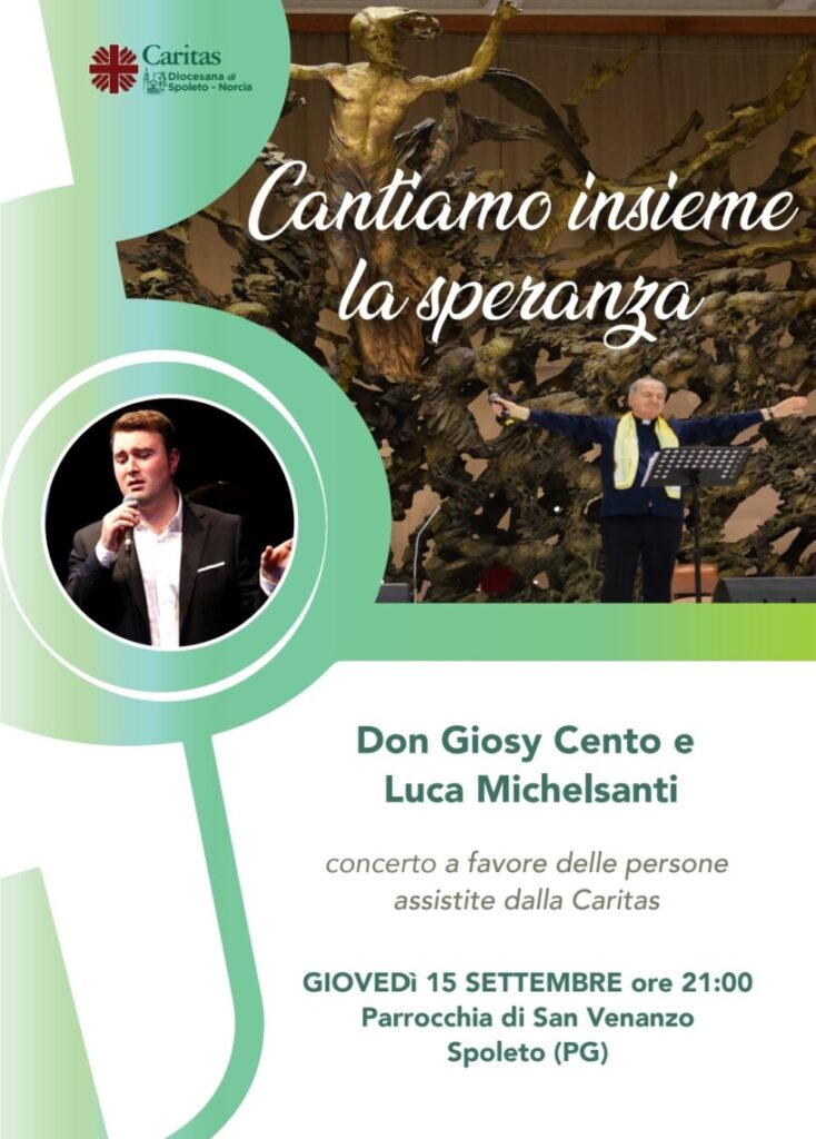 Giovedì 15 settembre 2022 alle ore 21.00 presso la palestra dell’Oratorio di S. Venanzo di Spoleto si terrà il concerto “Cantiamo la speranza” con don Giosy Cento e Luca Michelsanti a favore delle persone in difficoltà. L’ingresso è ad offerta.