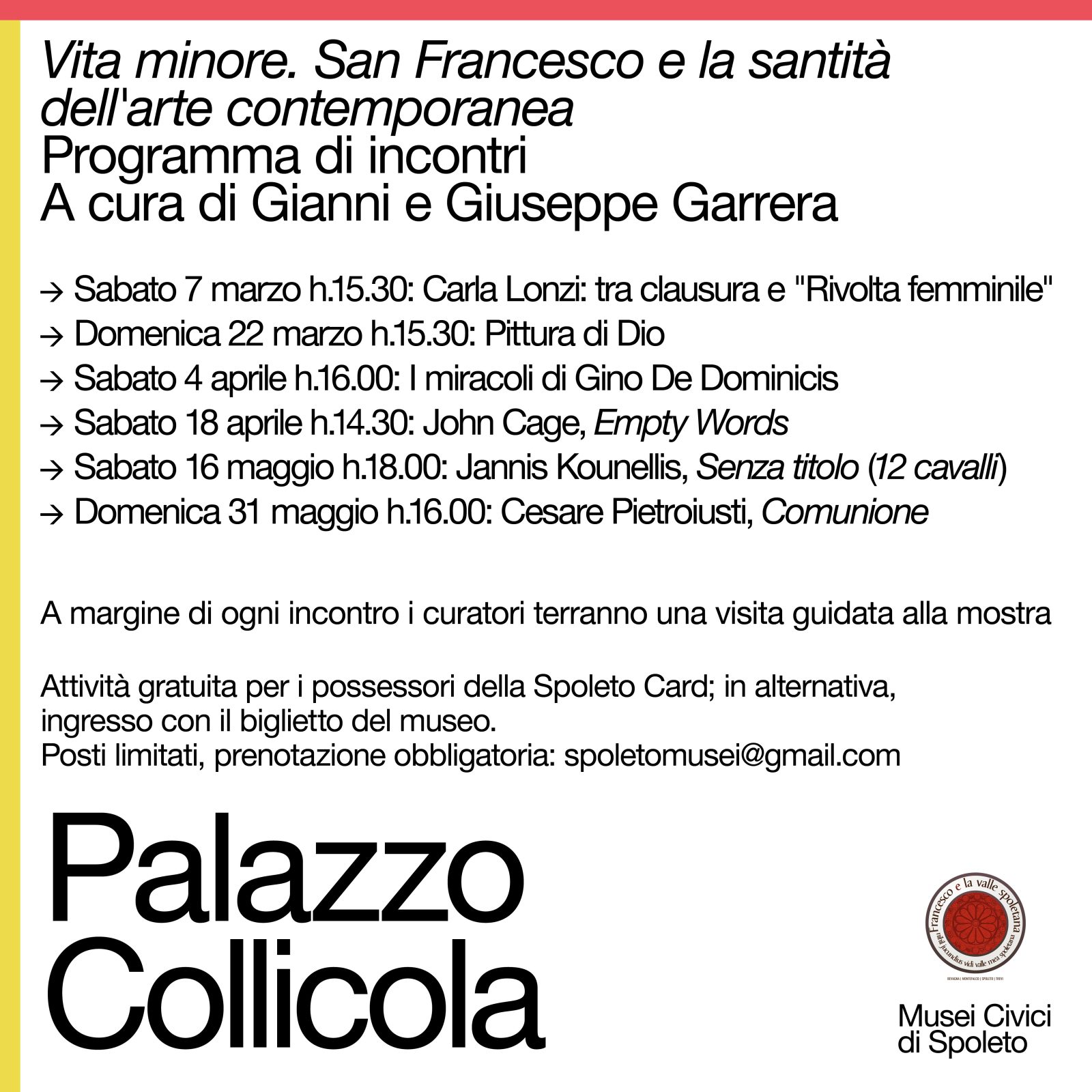 Sabato 7 marzo alle ore 15.30 a Palazzo Collicola si terrà Carla Lonzi: tra clausura e “Rivolta femminile”, il primo di sei incontri curati da Gianni e Giuseppe Garrera per la mostra Vita minore. San Francesco e la santità dell’arte contemporanea.