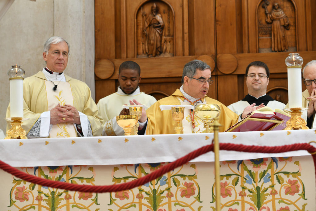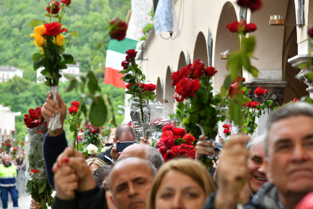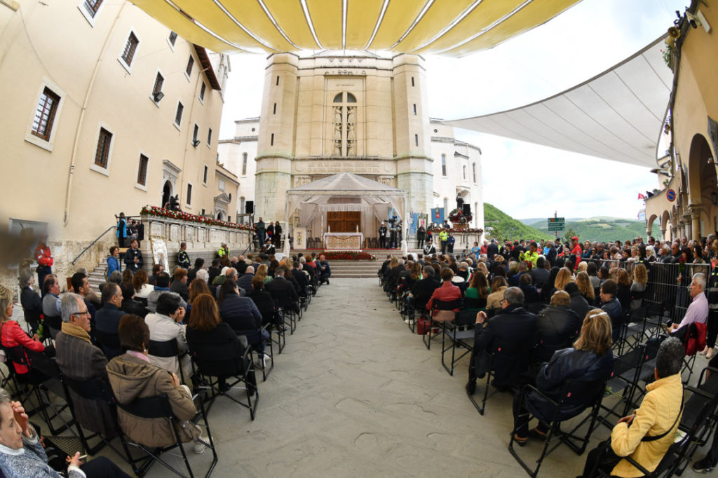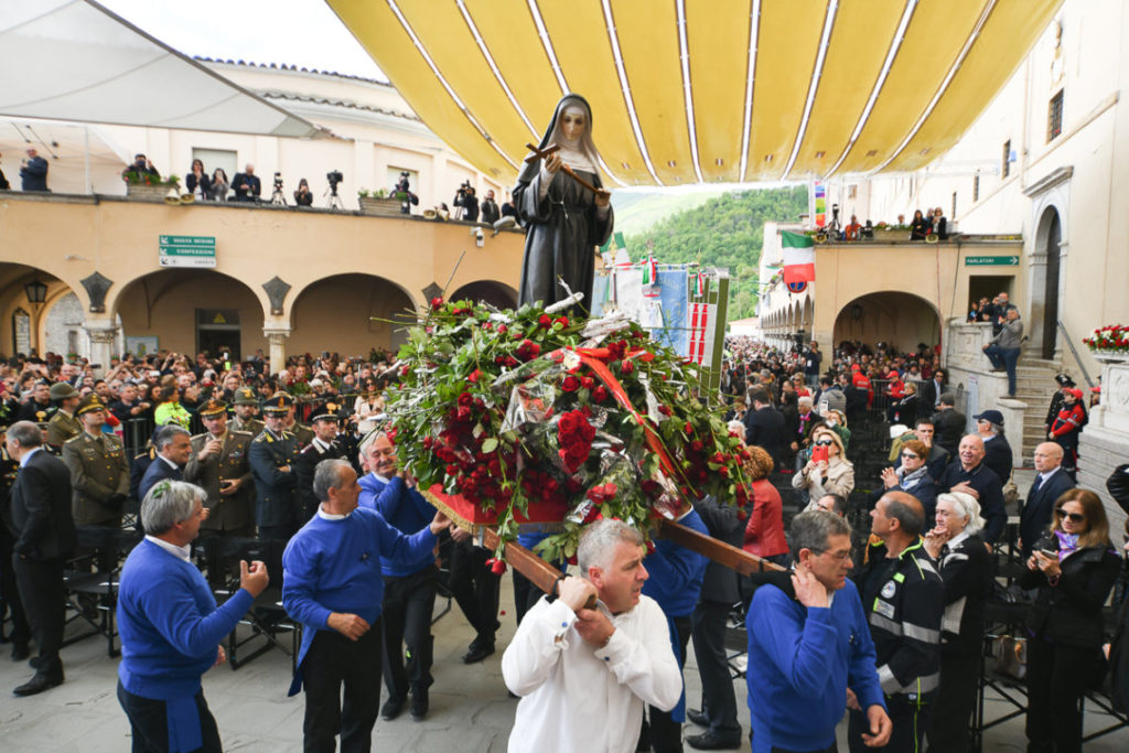 «Carissimo/a questo giorno ci ricorda che a Dio tutto è possibile. Buona festa di Santa Rita». Questo è il messaggio che mercoledì 22 maggio 2019, di buon mattino, hanno ricevuto sul telefonino i tantissimi devoti della Santa dei casi impossibile in un qualche modo collegati col santuario di Cascia. Mittente: le monache agostiniane di Cascia custodi del corpo della Santa ed eredi del suo messaggio spirituale. La giornata poi è stata avviata dalla tradizionale processione con la statua della Santa partita da Roccaporena, paese natale di Rita: giunta in città si è unita al corteo storico che ogni anno ripropone i momenti salienti della vita di questa grande donna. Il tutto è culminato dinanzi alla Basilica, dove alle 11.00 il cardinale Giovanni Angelo Becciu, prefetto della Congregazione delle Cause dei Santi, ha presieduto il solenne pontificale. Hanno concelebrato: mons. Renato Boccardo arcivescovo di Spoleto-Norcia, mons. Giovanni Scanavino vescovo emerito di Orvieto-Todi, sacerdoti dell’ordine di S. Agostino e diocesani. Nutrita la presenza delle autorità civili e militari. Ma soprattutto erano veramente tanti, come sempre, i devoti della Santa giunti a Cascia, colle della speranza, da ogni parte d’Italia e da alcuni Paesi del mondo.