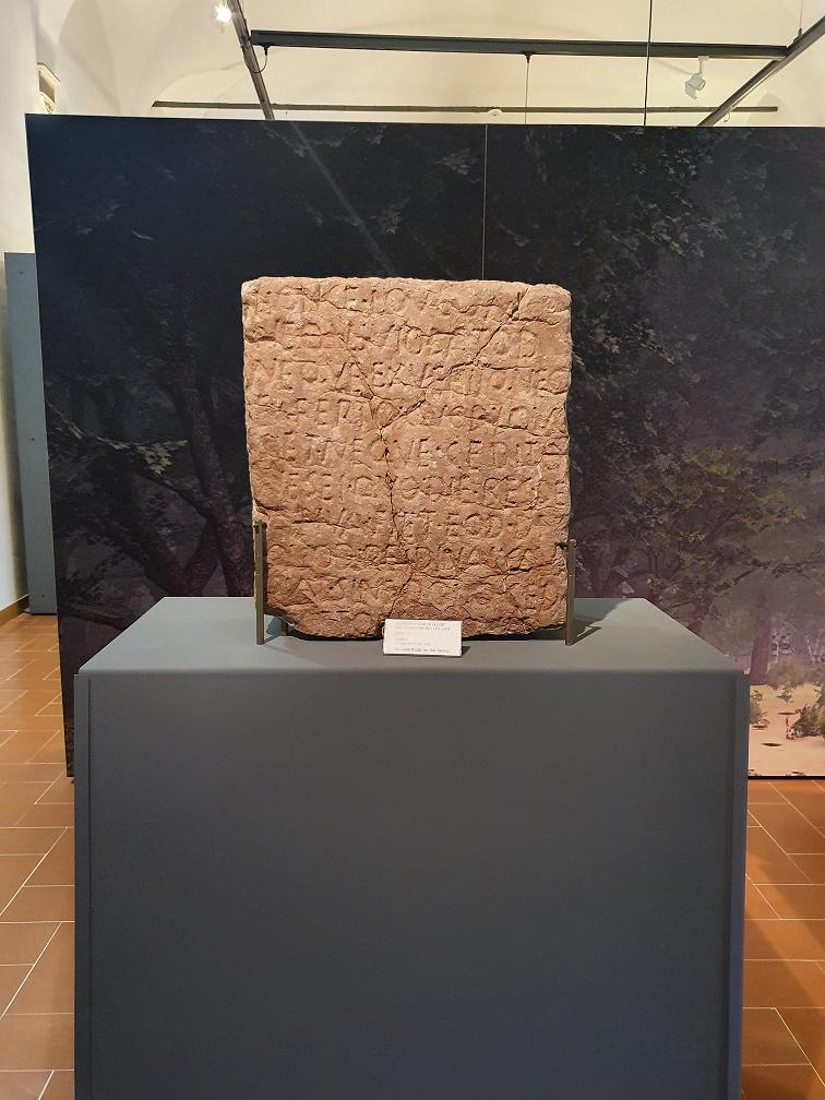 Una pietra calcarea con scritte in latino arcaico, a difesa dell’ambiente, ritrovata a Castel Ritaldi nel 1876 in località San Quirico grazie al famosissimo archeologo Giuseppe Sordini.