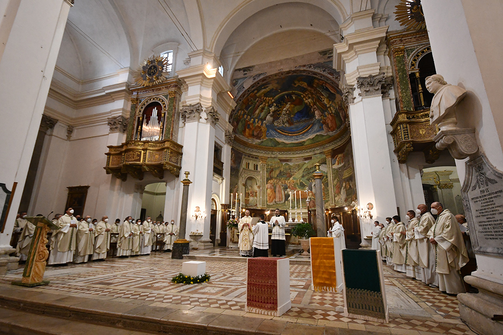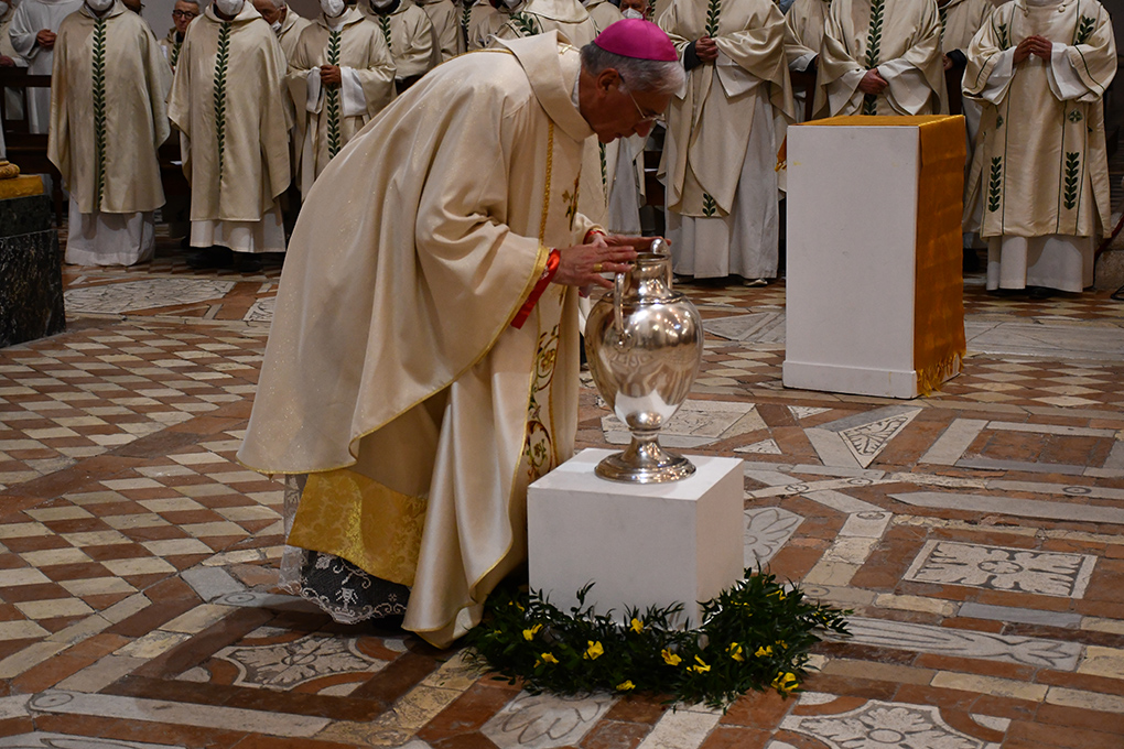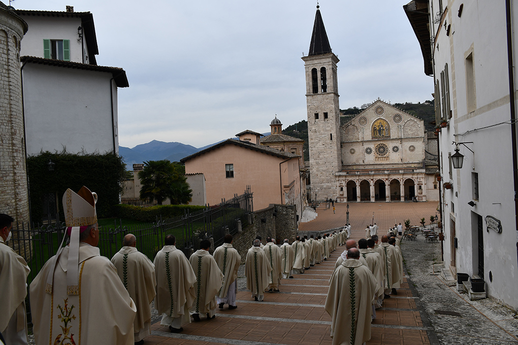Nel tardo pomeriggio di mercoledì 13 aprile 2022 nella Basilica Cattedrale di Spoleto l’arcivescovo di Spoleto-Norcia mons. Renato Boccardo, insieme a tutti i presbiteri, diocesani e religiosi, ha presieduto la Messa Crismale. Questa celebrazione sottolinea l’unità della Chiesa raccolta intorno al proprio Pastore; in questa Messa vengono consacrati gli Oli Santi (il Crisma, quello dei Catecumeni e quello degli Infermi) e i presbiteri rinnovano le promesse fatte nel giorno della loro ordinazione. La liturgia è stata animata dalla corale diocesana diretta da Mauro Presazzi, con all’organo Angelo Silvio Rosati. Il servizio all’altare è stato curato dai seminaristi e da un bel gruppo di ministranti, coordinati dal cerimoniere arcivescovile don Pier Luigi Morlino.