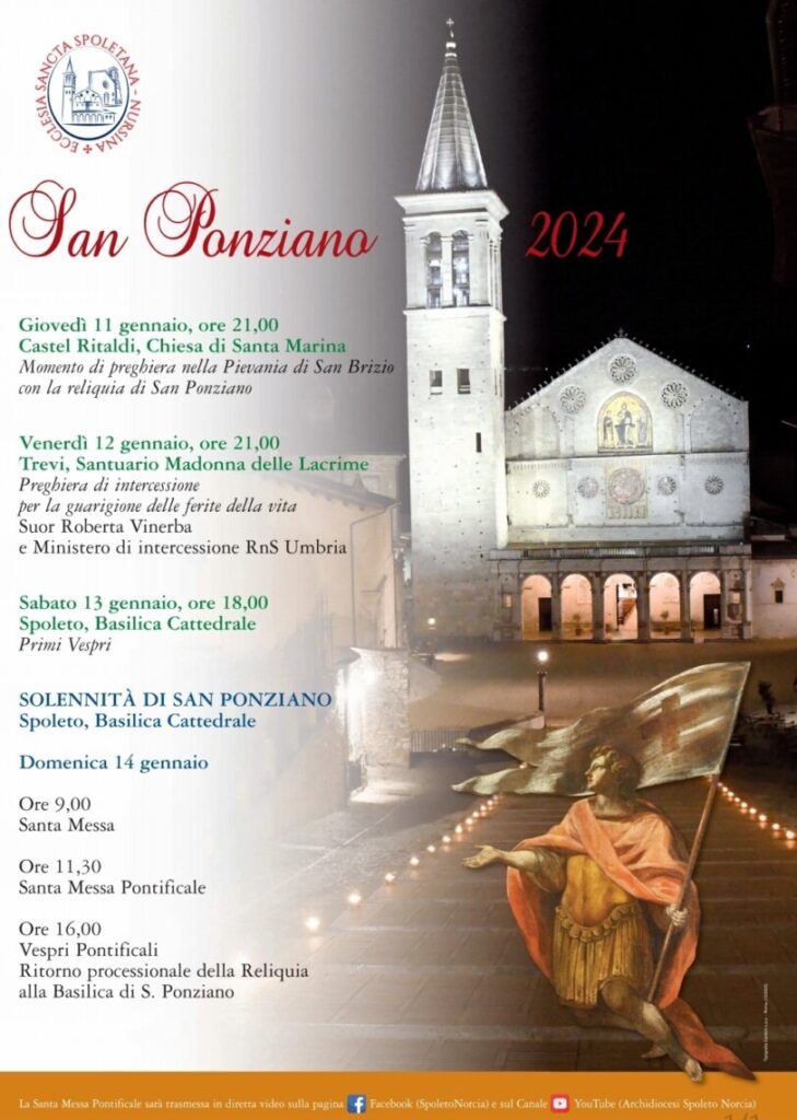 - Domenica 14 gennaio, ore 16.00, Spoleto, Basilica Cattedrale: Vespri Pontificali e ritorno processionale della Reliquia alla Basilica di S. Ponziano.