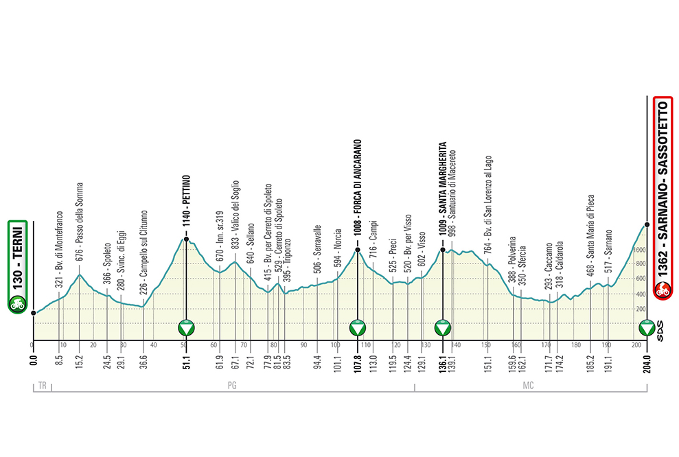Si tratta di una tappa molto impegnativa con 6 salite di cui 4 classificate GPM. Dopo la partenza dalla Città dell’acciaio, i ciclisti percorreranno il Valico della Somma per poi scendere a Spoleto e dopo aver raggiunto Campello sul Clitunno saliranno sulla salita di Pettino (15 km con pendenze attorno al 6/7%).