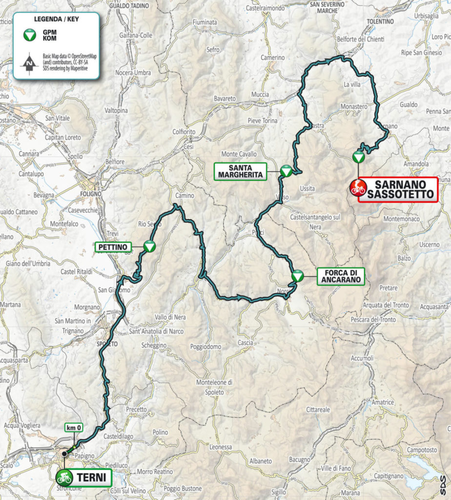 Successivamente supereranno il Valico del Soglio, Sellano, Cerreto di Spoleto e Norcia per affrontare il GPM di Forca di Ancarano e entrare nei monti Sibillini.