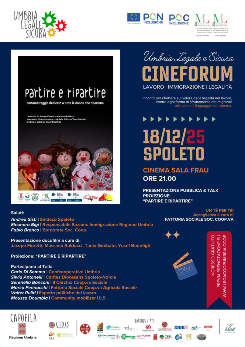 Cineforum “Lavoro – Immigrazione – Legalità” Proiezione del documentario Partire e Ripartire Giovedì 18 dicembre 2025 – ore 21:00 Cinema Sala Frau – Spoleto Nell’ambito del percorso “Umbria Legale e Sicura – Cineforum Lavoro Immigrazione Legalità”, iniziativa regionale dedicata alla riflessione sui temi della legalità nel lavoro, dell’inclusione e del contrasto allo sfruttamento dei migranti attraverso il linguaggio del cinema, giovedì 18 dicembre si terrà a Spoleto, presso la Sala Frau, la proiezione del film documentario Partire e Ripartire, realizzato dai progetti SAI di Spoleto e Castel Ritaldi. La serata si aprirà alle ore 20:30, con una tisana e biscotti offerti dai ragazzi della Fattoria Sociale, momento di accoglienza che precederà l’inizio dell’incontro ufficiale. Alle ore 21:00 sono previsti i saluti istituzionali e la presentazione del film a cura degli autori (Jacopo Fioretti e Massimo Balducci – registi; Tania Gobbato – arteterapeuta; Yusef Buonfigli – mediatore culturale). Seguirà la proiezione del documentario (durata 34 minuti), dedicato al tema del ripartire come esperienza personale e collettiva delle donne coinvolte nei percorsi di accoglienza. Parteciperanno all’evento: Andrea Sisti, Sindaco di Spoleto Eleonora Bigi, Responsabile Sezione Immigrazione Regione Umbria Fabio Branco, Borgorete Soc. Coop. Carlo Di Somma, Confcooperative Umbria Silvia Antonelli, Caritas Diocesana Spoleto-Norcia Valter Puliti, Esperto politiche del lavoro Moussa Doumbia, Community mobilizer ULS Saranno inoltre presentate testimonianze di esperienze imprenditoriali locali, a cura di: Serenella Banconi, Il Cerchio Cooperativa Sociale Marco Pennacchi, Fattoria Sociale Coop. Agricola e Sociale A moderare l’incontro sarà Fabio Branco. L’evento è gratuito e rientra nel programma del Cineforum “Umbria Legale e Sicura”, un ciclo regionale che utilizza il cinema come strumento di dialogo e sensibilizzazione sui temi del lavoro, dell’immigrazione e della legalità.