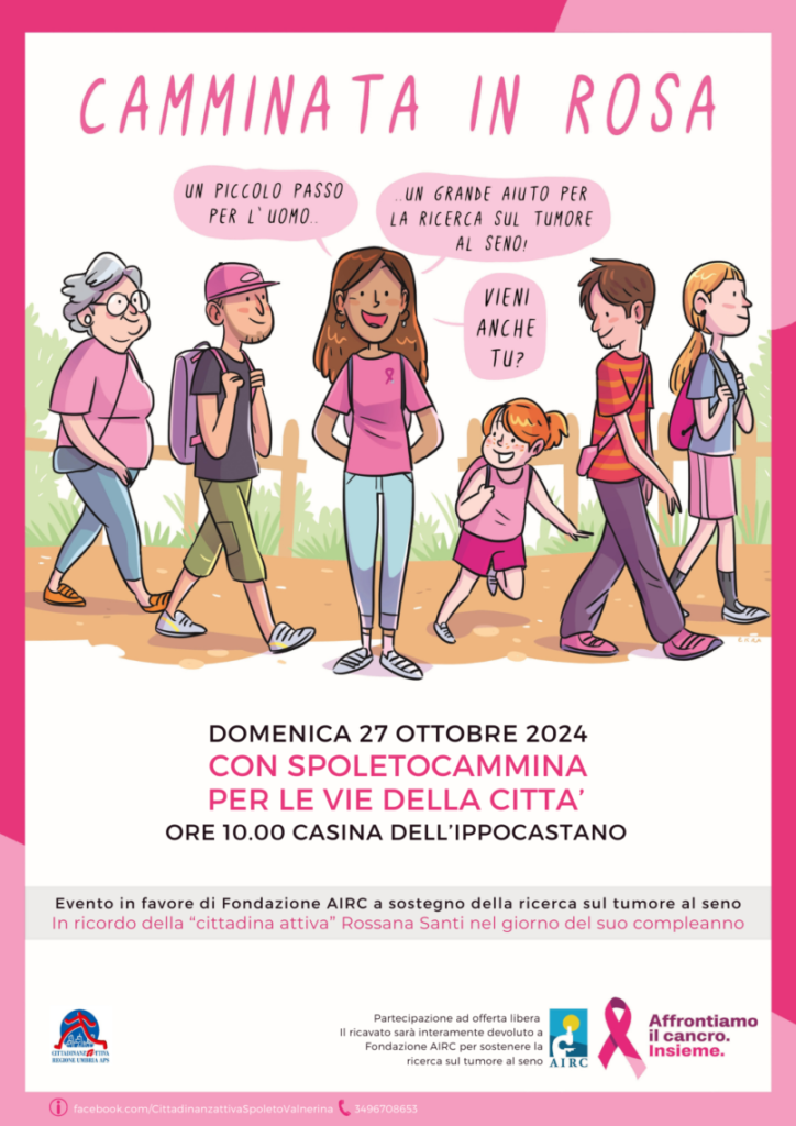 A sostegno della ricerca, Cittadinanzattiva organizza un’edizione speciale di “SpoletoCammina”, una camminata in rosa per le vie della città, il 27 Ottobre alle ore 10 con partenza dalla Casina dell’Ippocastano in viale Matteotti, in ricordo della nostra grande “cittadina attiva” Rossana Santi nel giorno del suo compleanno.