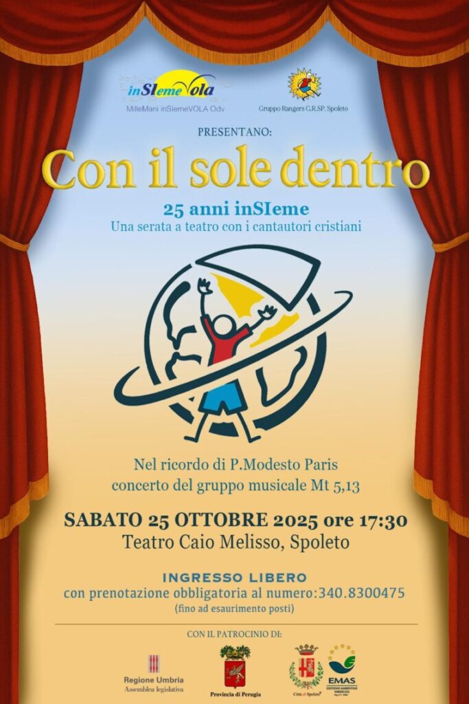 Si intitola “Con il sole dentro: 25 anni insieme” lo spettacolo a ingresso gratuito che si terrà sabato 25 ottobre al Teatro Caio Melisso di Spoleto con inizio alle 17.30. A promuoverlo sono le associazioni MilleMani inSIemeVOLA odv e Gruppo Rangers G.R.SP. Spoleto che quest’anno festeggiano 25 anni di attività.