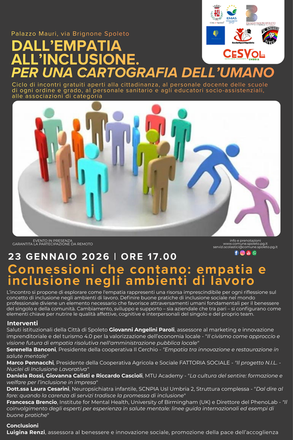 Il prossimo appuntamento, dal titolo “Connessioni che contano: empatia e inclusione negli ambienti di lavoro”, è in programma venerdì 23 gennaio alle ore 17.00. L’incontro si propone di esplorare come l’empatia rappresenti una risorsa imprescindibile per ogni riflessione sul concetto di inclusione negli ambienti di lavoro. Definire buone pratiche di inclusione sociale nel mondo professionale diviene un elemento necessario che favorisce attraversamenti umani fondamentali per il benessere del singolo e della comunità. Cambiamento, sviluppo e supporto – sia aziendale che tra pari – si configurano come elementi chiave per nutrire le qualità affettive, cognitive e interpersonali del singolo e del proprio team.