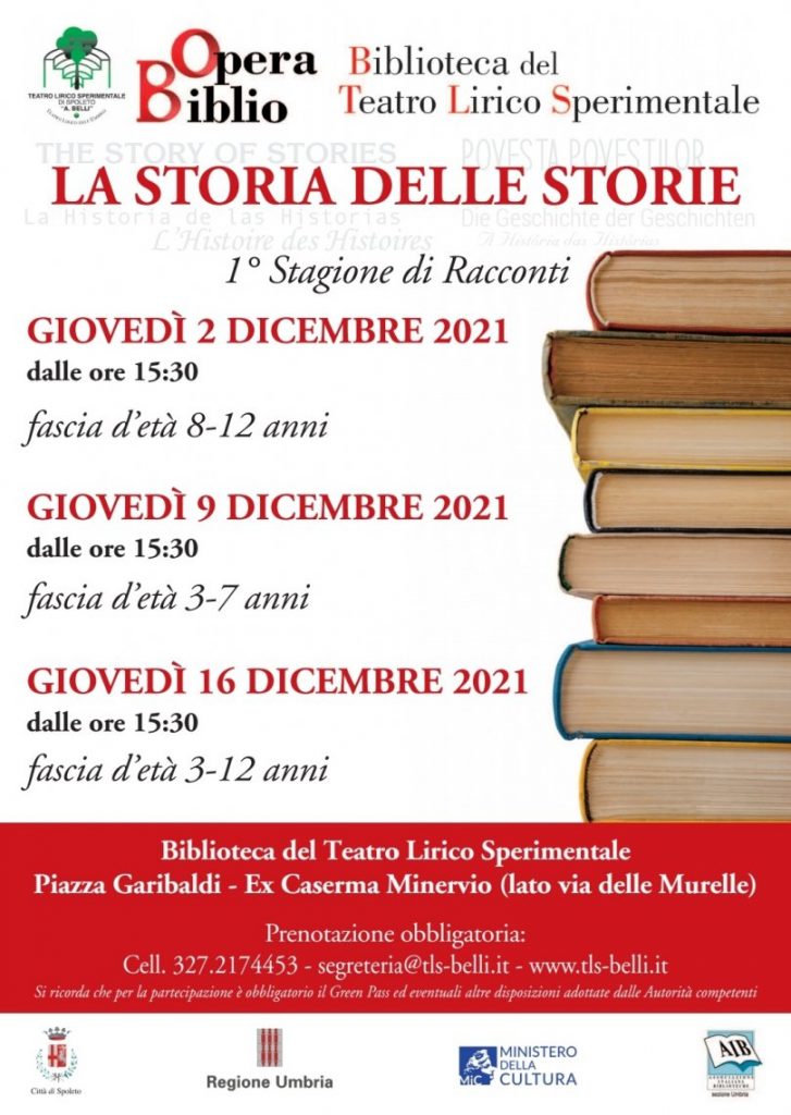 Continua l’intensa attività di OperaBiblio – Biblioteca del Teatro Lirico Sperimentale di Spoleto “A. Belli” inaugurata lo scorso mese di settembre. Questa volta si tratta di una “stagione” di racconti “La storia delle storie”, ciclo di letture curato da BibliOpera – Biblioteca del Teatro Lirico Sperimentale e che ha come tema cardine l’inclusione, la tolleranza e le tradizioni. “La storia delle storie” consta di 3 appuntamenti rivolti a diverse fasce d’età, tutti di giovedì pomeriggio, dalle ore 15.30 e presso i locali della biblioteca del Teatro Lirico Sperimentale in Piazza Garibaldi, s.n.c. – Ex Caserma Minervio (ingresso dal lato di via delle Murelle).