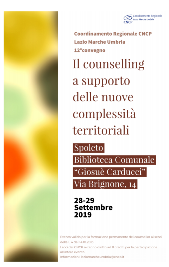 Oltre 70 counsellor professionisti si sono dati appuntamento a Spoleto il 28 e 29 settembre per seguire il convegno dal titolo “Il counselling a supporto delle nuove complessità territoriali”, il 12° organizzato dal Coordinamento regionale Lazio-Marche-Umbria del CNCP, Coordinamento Nazionale Counsellor Professionisti. Il CNCP è un’associazione nata nel 2002 per promuovere la diffusione del counselling e successivamente per definirne e attestarne gli standard qualitativi, in accordo con la Legge n. 4/2013.