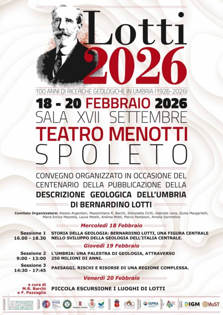 In occasione del centenario della pubblicazione della “Descrizione Geologica dell’Umbria” di Bernardino Lotti, nella prestigiosa sede del Teatro Nuovo Gian Carlo Menotti di Spoleto, si terrà dal 18 al 20 febbraio 2026 il convegno “Lotti 2026: 100 anni di ricerche geologiche in Umbria“.